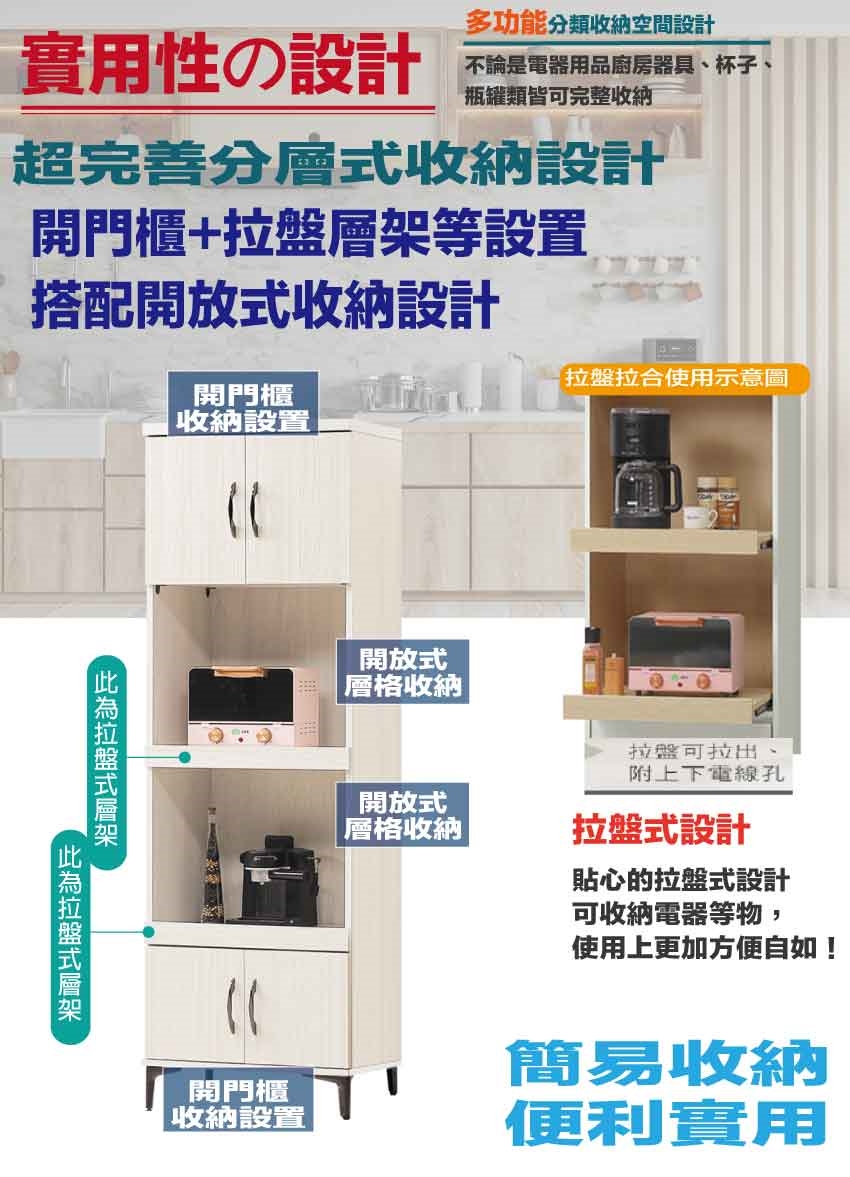 搭配採用開門櫃+開放層格+拉盤層架等收納空間設計