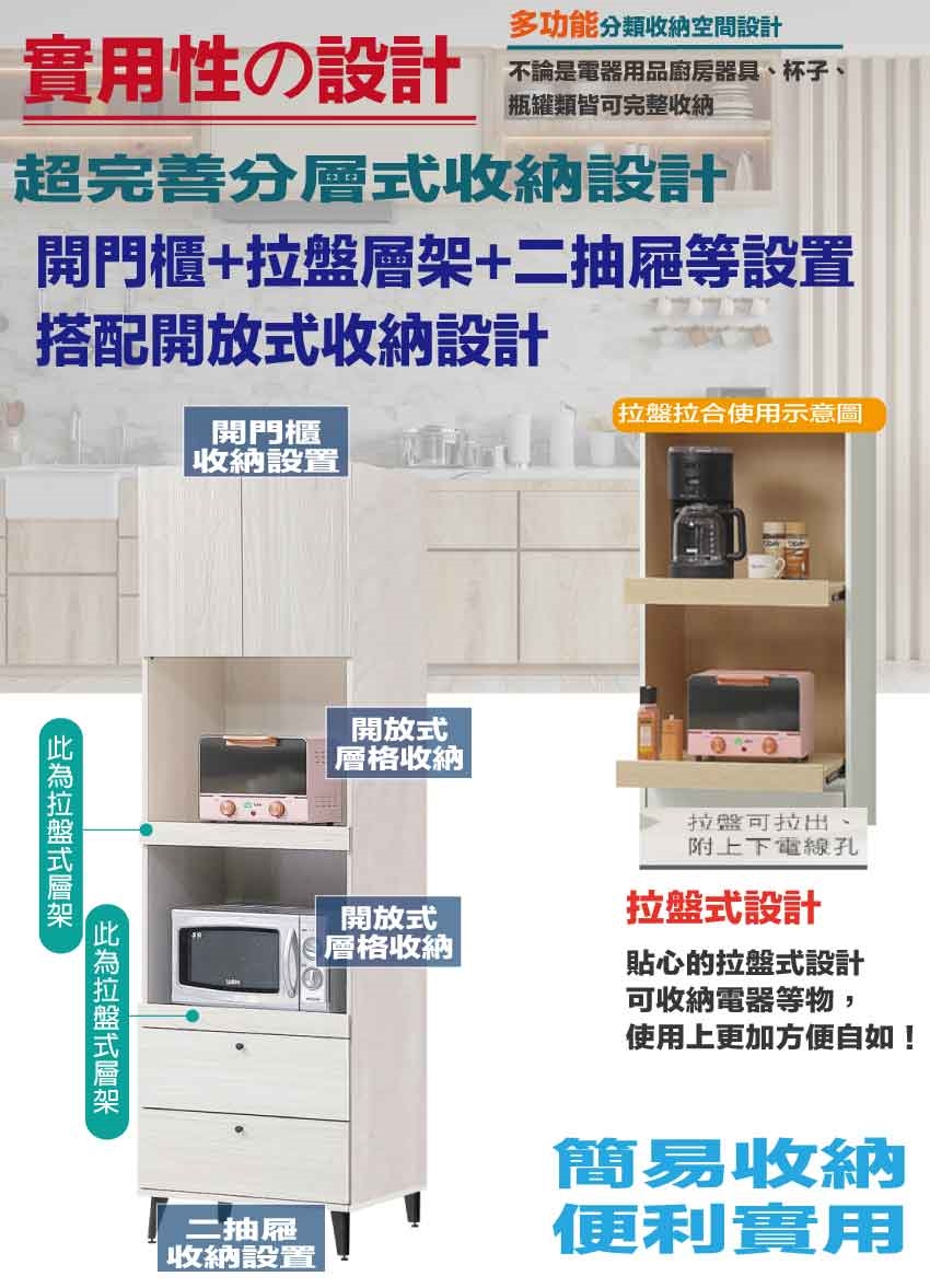 搭配採用開門櫃+二抽屜+開放層格+拉盤層架等收納空間設計