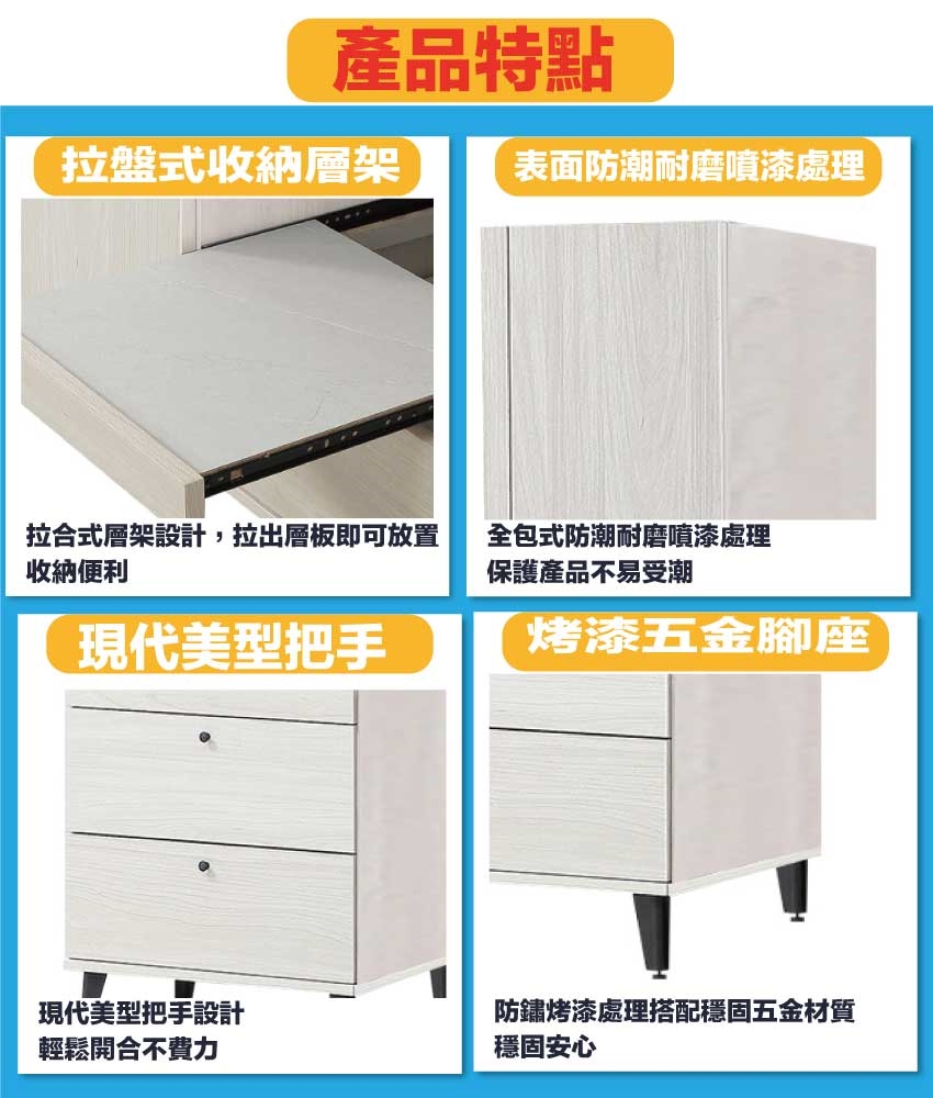 材質:防蛀木心板+五金滑軌結構+烤漆五金腳座+防夾手緩衝門片五金