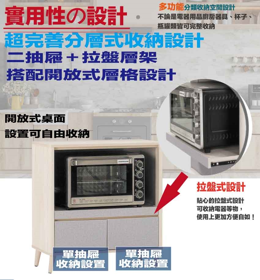 搭配採用二抽屜+開放層格+拉盤層架等收納空間設計