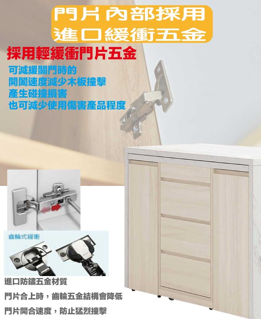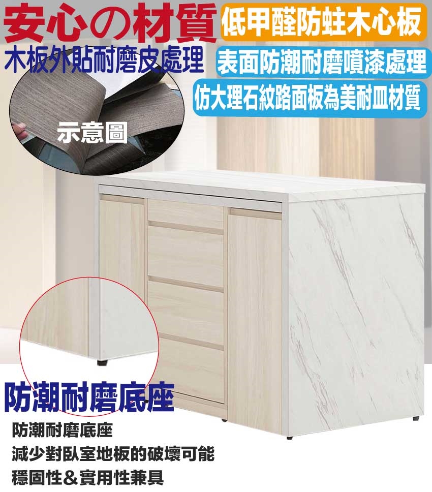 採用防蛀木心板+防潮耐磨底座+底部滑輪設置(可固定位置)+五金滑軌結構+仿大理石紋耐磨美耐皿桌面板+防夾手緩衝門片五金等安心材質製造