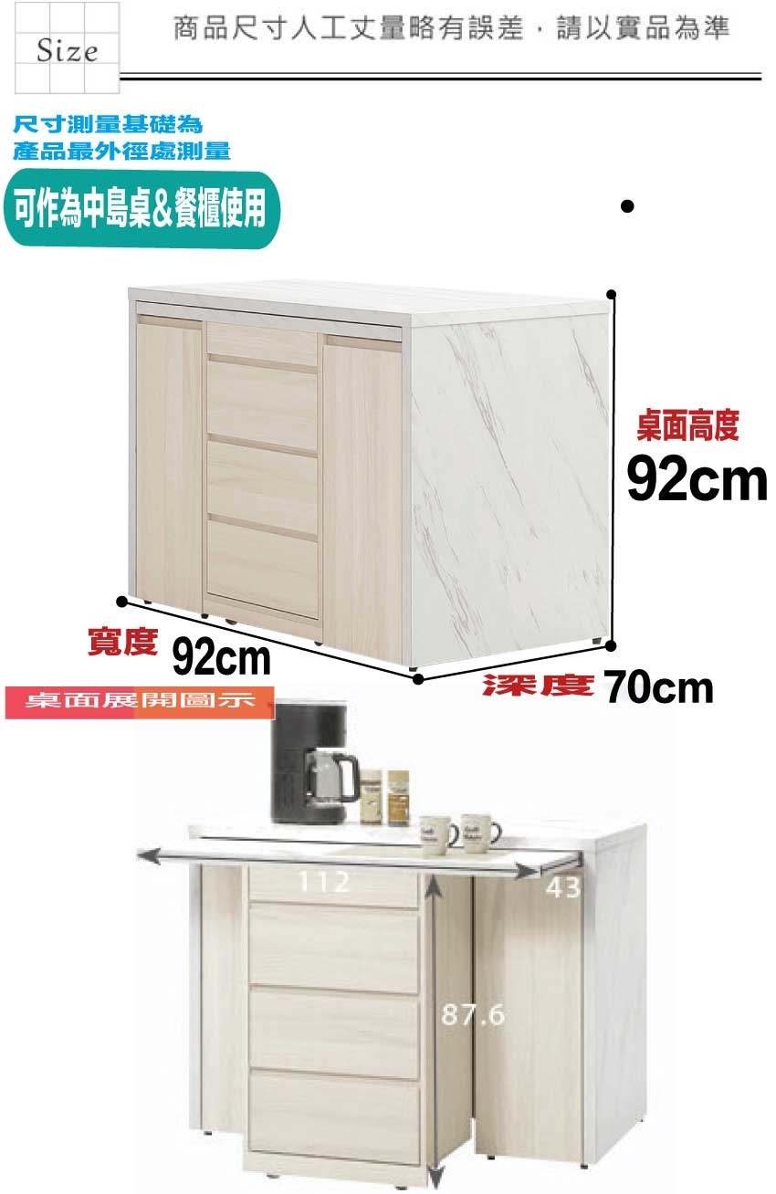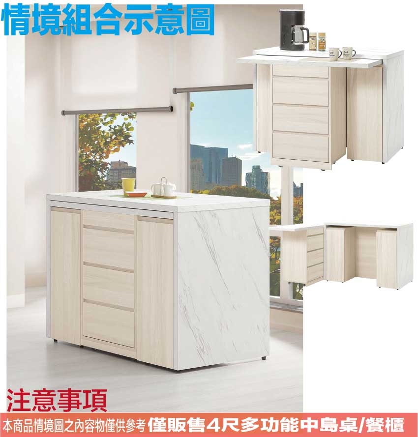 尺寸:寬120x 深70x 高x92(公分) 中島桌尺寸:寬112x 深x43x 高x88(公分) ◆材質: 材質:防蛀木心板+防潮耐磨底座+底部滑輪設置(可固定位置)+五金滑軌結構+仿大理石紋耐磨美耐皿桌面板燈+防夾手緩衝門片五金 噴漆:防潮耐磨噴漆處理 ◎注意事項: 1.接單後,會有專員與您電聯確認送貨時間。 2.需以吊車吊運以當地吊車行情計,費用由消費者支付。 3.備註:本商品不含圖片上、家飾...等,情境圖之內容僅供參考。 4.請於配送人員到場時,檢查商品有無缺失,以免造成爭議。 5.允許的誤差尺寸範圍+-2%。 6.因拍攝燈光與電腦解析度瑩幕不同可能會造成實品與網頁上商品有些許色差,商品以收到實品為主。 ◎收貨與退貨: 1.實因特殊地型限制及(山區、濱海鄉、鎮、村、區)無法送貨時,本公司保有出貨與否之權利(下單後會由專人告知是否可配送)。 2.有電梯不收取費用! 無電梯樓層超過4樓以上(包含4樓)一樓層費用200元,現場支付給服務員。 3.超過鑑賞期,恕不接受退貨。 4.限非人為因素破壞毀損,才可退貨。 5.若退貨時,收件時間請與廠商協調,確保自己權益。 6.退貨時應保留贈品及附件完整(如有遺失部分,需酌收費用)。 ◎備註: .無回收服務。 .收貨與退貨:實因特殊地型限制及(山區、濱海鄉、鎮、村、區)無法送貨時,本公司保有出貨與否之權利(下單後會由專人告知是否可配送)。 .花蓮(縣市)、台東(縣市)、屏東(縣市場及其它縣市屬於山區、濱海鄉、鎮、村地區無配送服務,如您有需求,則需另外收取運費。(您可直接訂購,後續由廠商報價。) ※由於加價配送服務為一次消耗性商品,若有退換貨等情形加購之運費恕無法退還 ※運費報價皆為單趟計算。 ※使用加價配送地區,收貨時間會比一般地區再增加10個工作天。