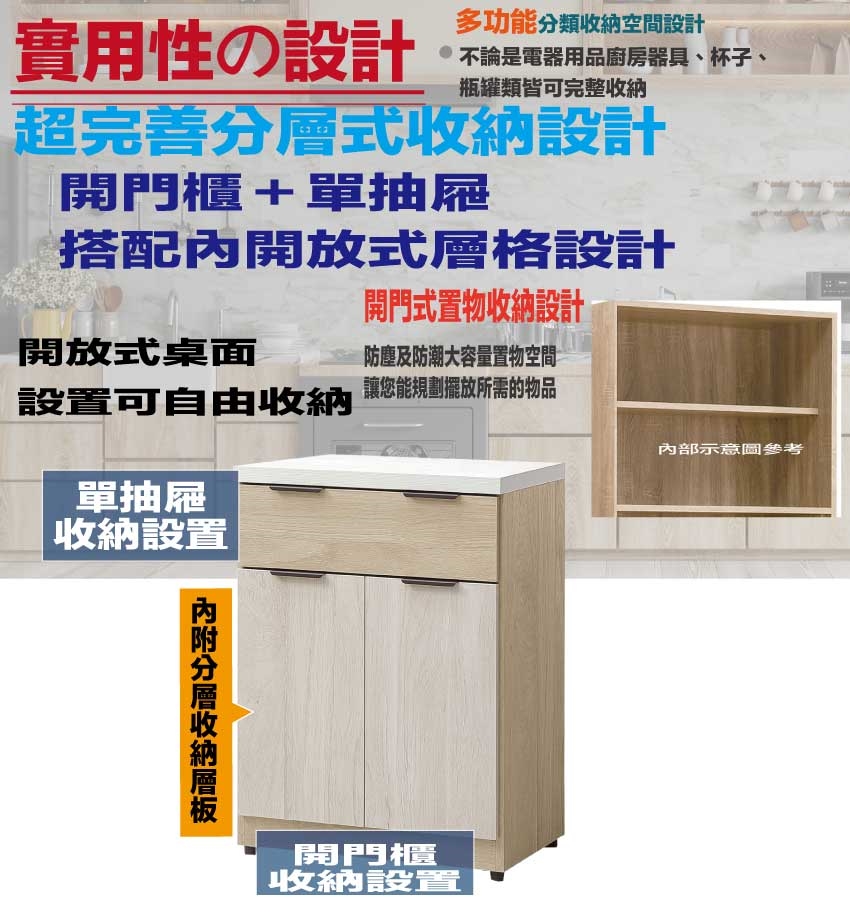 搭配採用開門櫃+單抽屜+內開放層格等收納空間設計