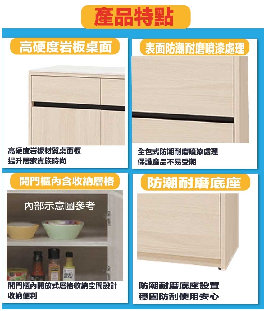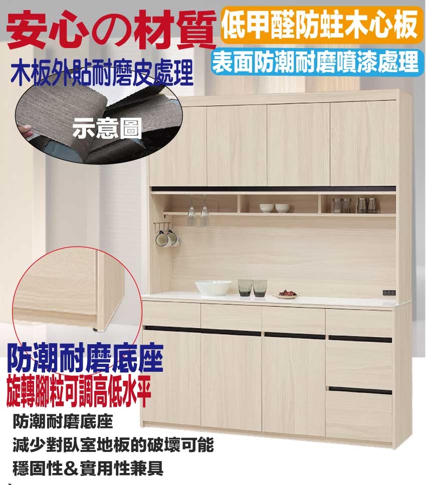 防蛀木心板+防潮耐磨底座(可調高低水平)+防夾手緩衝門片五金+8mm高硬度岩板桌面板五金等安心材質製造