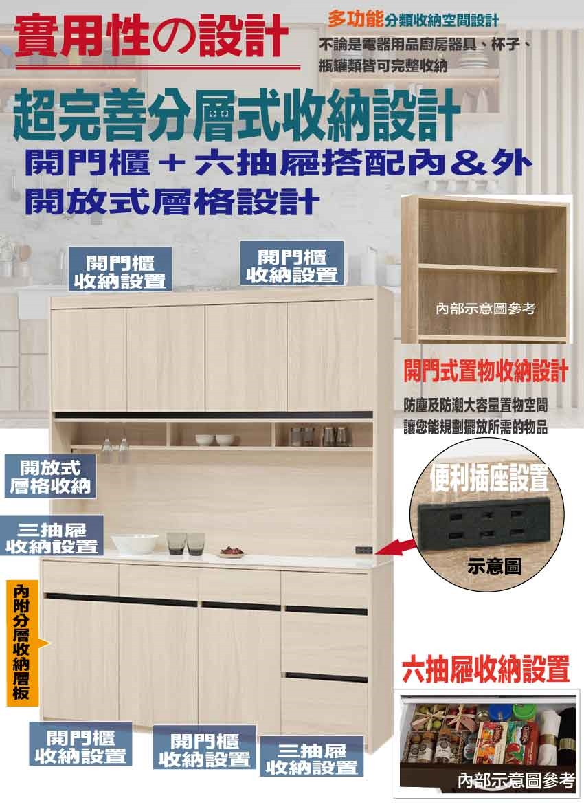 採用開門櫃+六抽屜+內&外開放層格等收納空間設計
