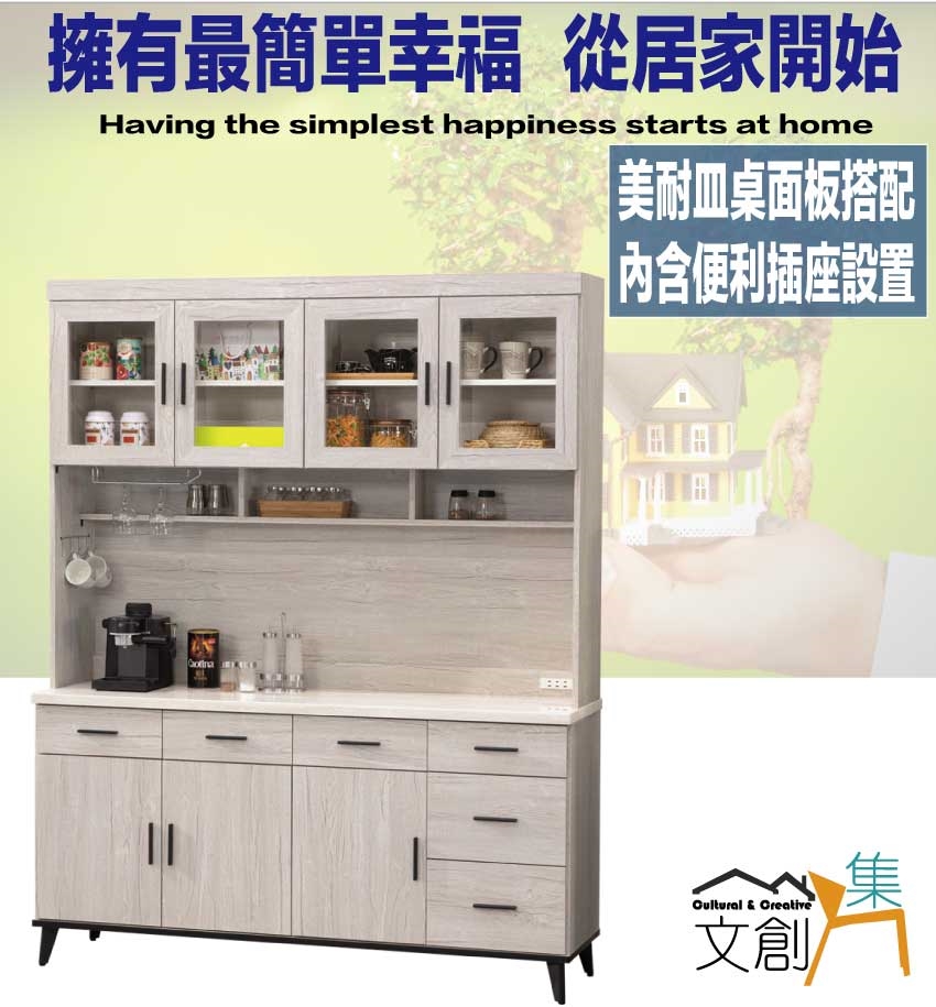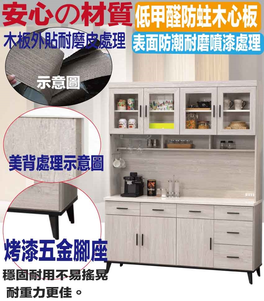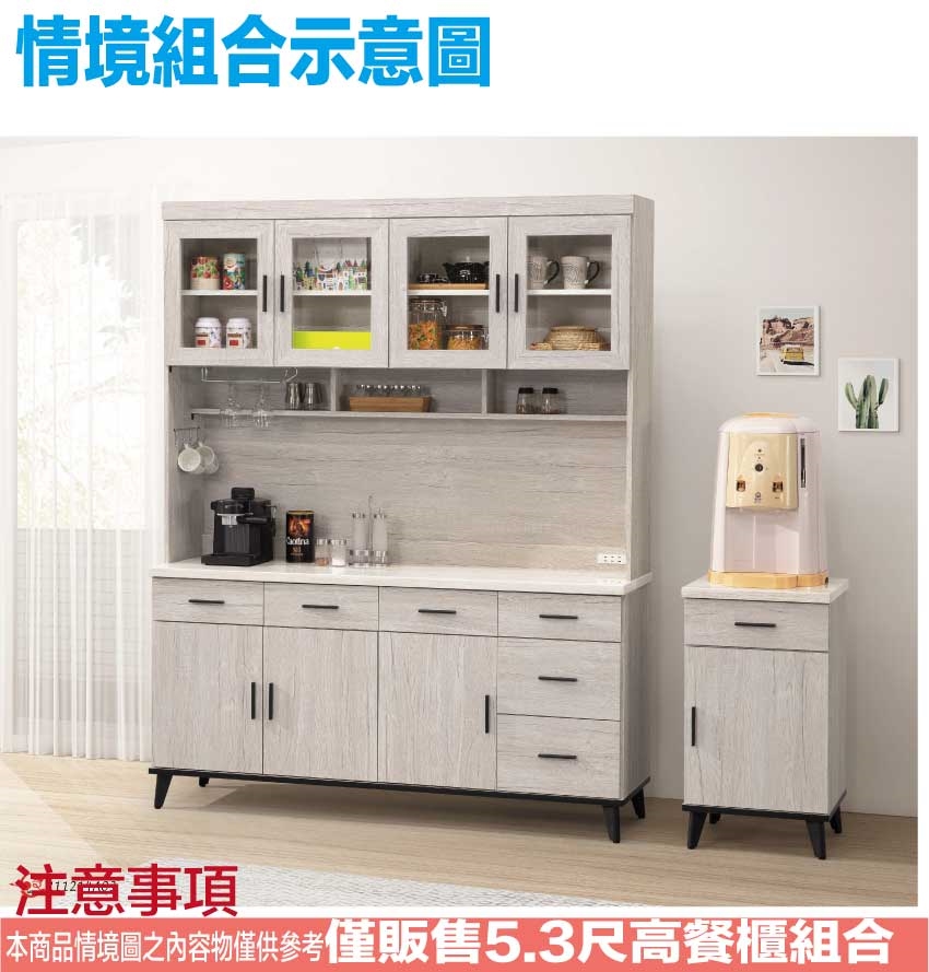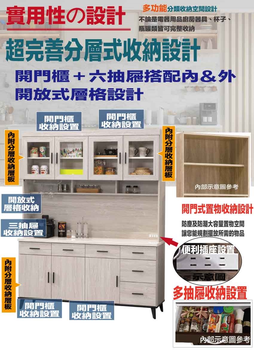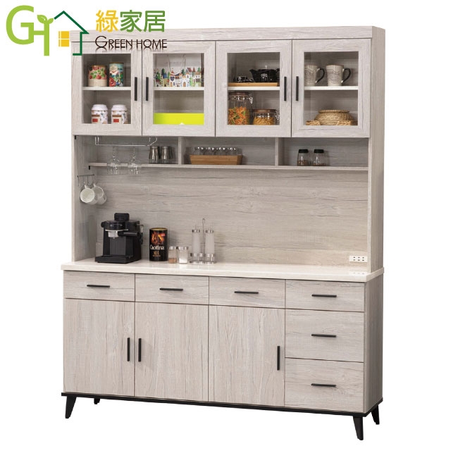 - 產品名稱:【綠家居】凱曼雙色5.3尺七門六抽高餐櫃組合(內含插座+仿石紋耐磨美耐皿桌面板)