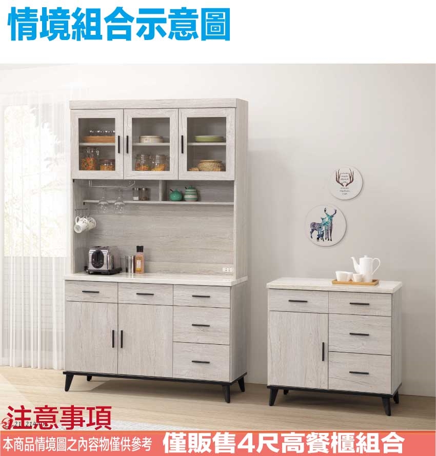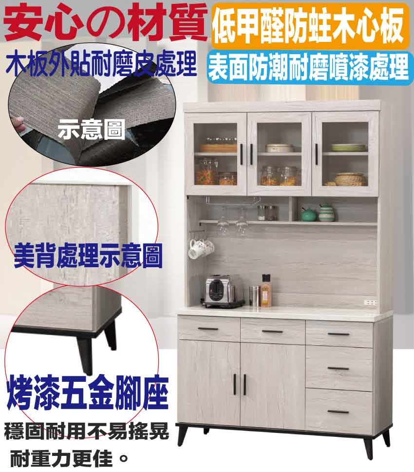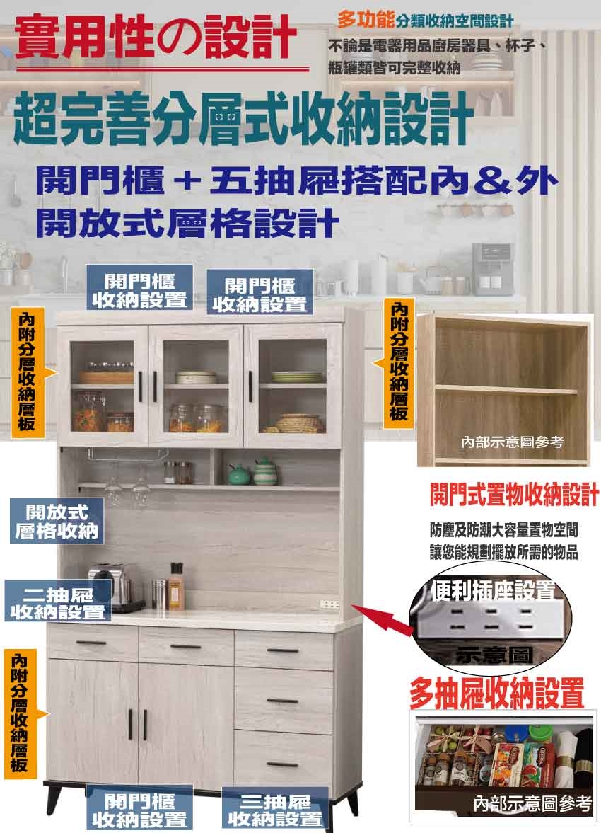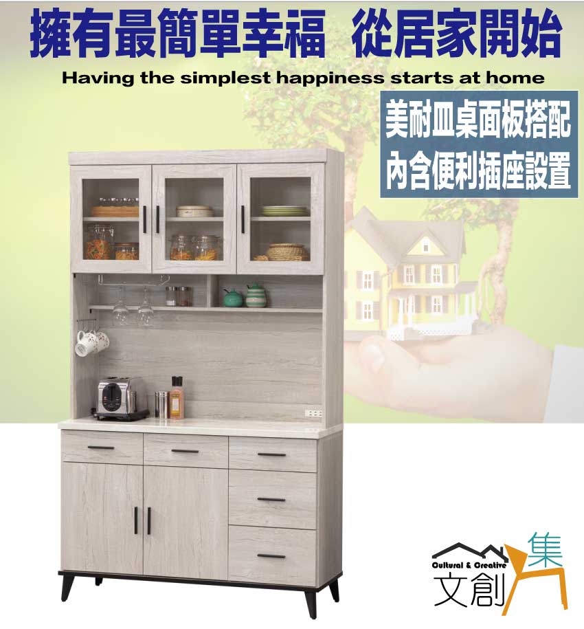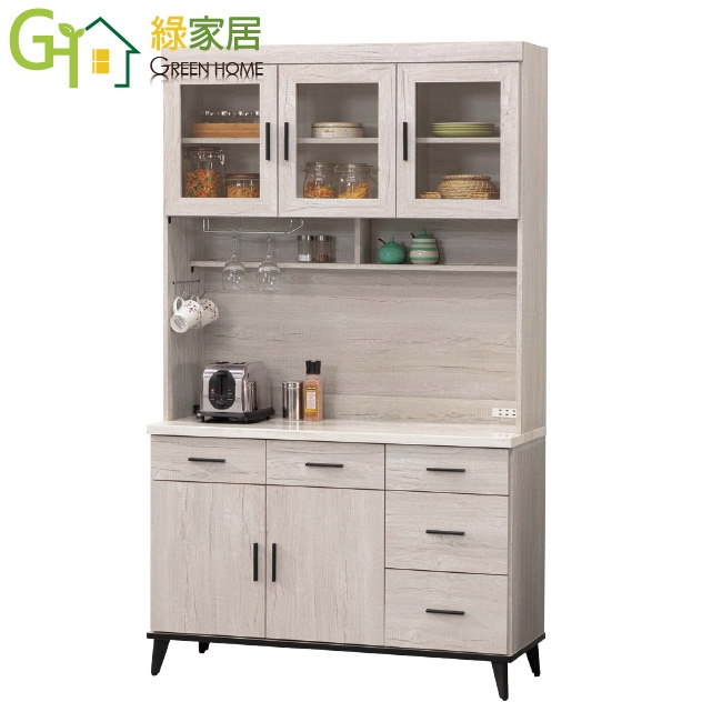 - 產品名稱:【綠家居】凱曼雙色4尺五門五抽高餐櫃組合(內含插座+仿石紋耐磨美耐皿桌面板)
