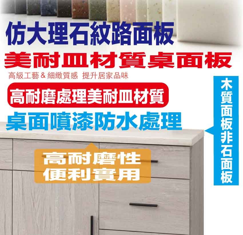 材質:防蛀木心板+仿大理石紋路耐磨美耐皿面板+烤漆金屬腳座+防夾手緩衝門片五金
