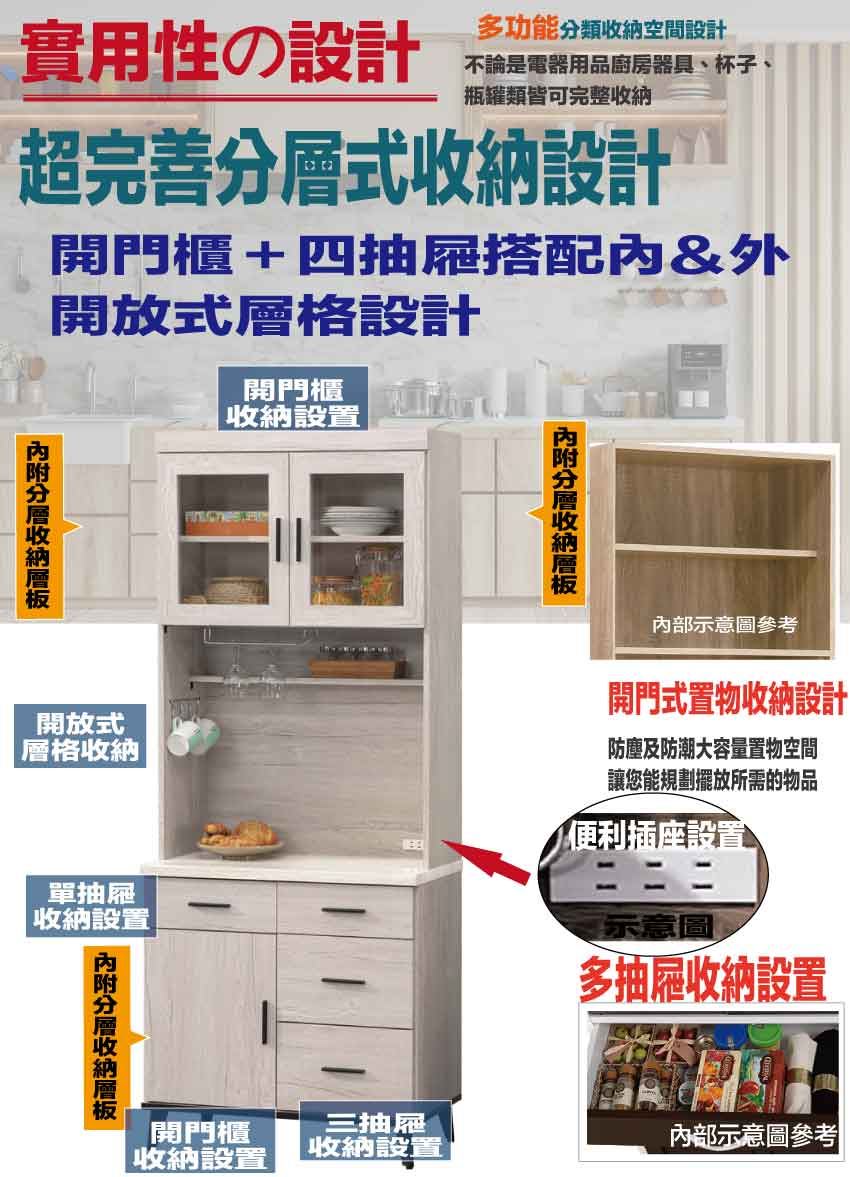 採用開門櫃+四抽屜+內&外開放層格等收納空間設計