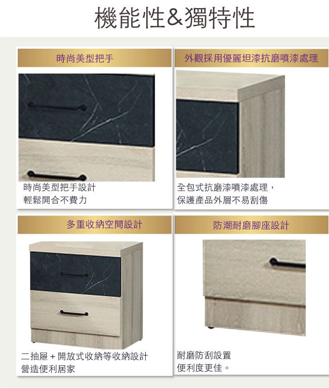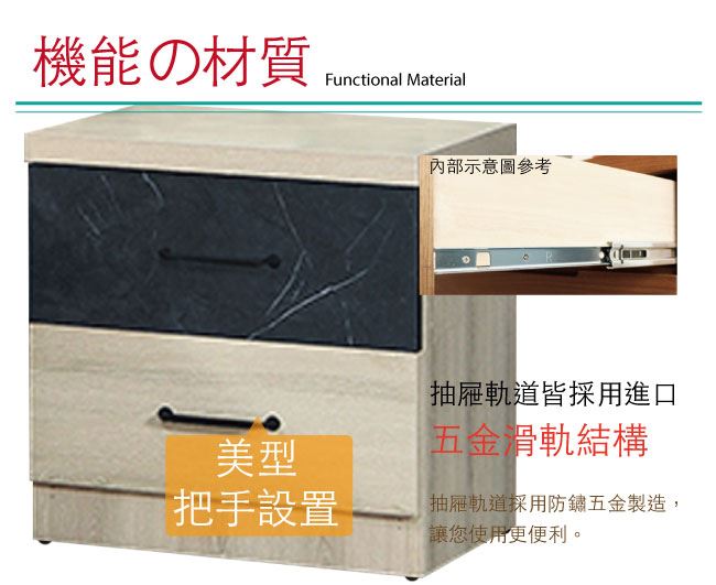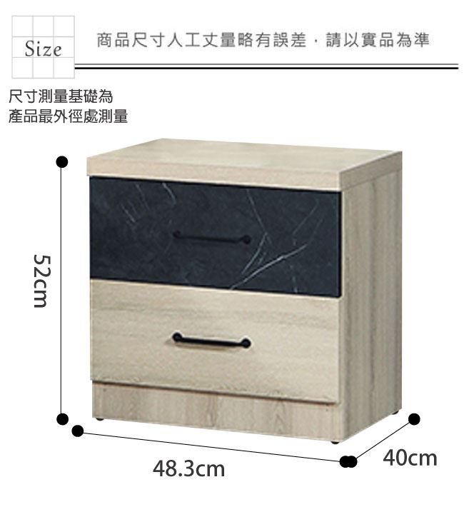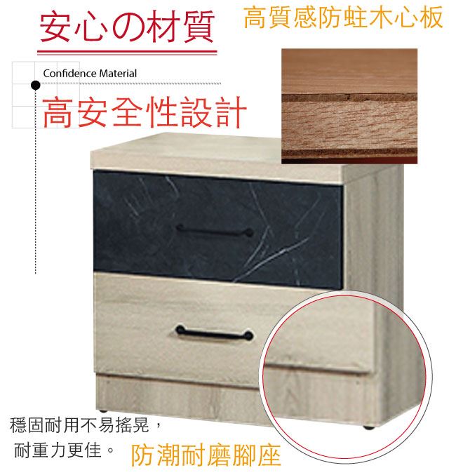 材質 | ◆產品名稱:【綠家居】 可倫坡 現代1.6尺二抽床頭櫃/收納櫃 產品尺寸: 收納櫃尺寸:(寬)48.3x(深)40x(高)52/公分 ◆材質: 材質:防蛀木心板+防潮耐磨腳座 材質:五金滑軌結構 塗漆:優利坦全包式耐磨噴漆處理 |