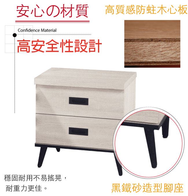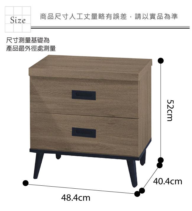 材質 | ◆產品名稱: 【綠家居】芬米 木紋1.6尺二抽床頭櫃/收納櫃(四色可選) 產品尺寸: 尺寸:(寬)48.4x(深)40.4x(高)52/公分 ◆材質: 材質:防蛀木心板+黑鐵砂腳座 材質:五金滑軌結構 塗漆:優利坦全包式耐磨噴漆處理