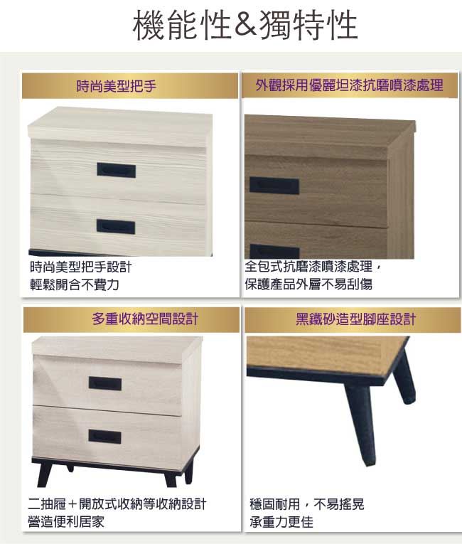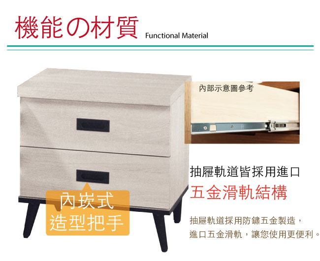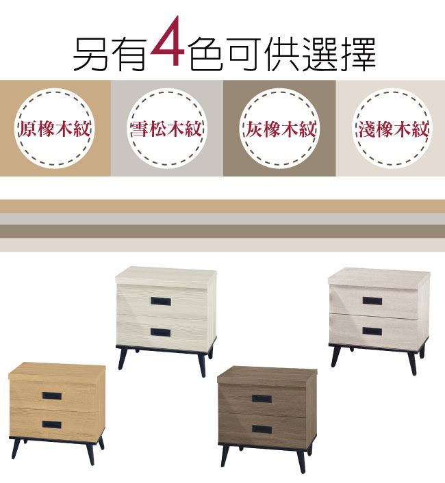 商品介紹 | 【綠家居】芬米 木紋1.6尺二抽床頭櫃/收納櫃(四色可選) 四色可選+現代簡約風格+安心材質製造,整體採用防蛀木心板+五金滑軌結構+黑鐵砂腳座等安心材質製造,外層採用優利坦全包式耐磨噴漆處理搭配二抽屜+開放式收納等收納設計,全由專人配送到家,專業安心服務,替你省下更多時間! 【商品特色】 四色可選+現代簡約風格+安心材質製造,使用放心+搭配居家更便利 採用防蛀木心板+五金滑軌結構+黑鐵砂腳座等安心材質製造 二抽屜+開放式收納等收納設計 此商品不需要DIY組立,此商品為組立後之成品 品質保證、專業設計、貼心服務 全由專人配送到家,專業安心服務,替您省下更多時間 |