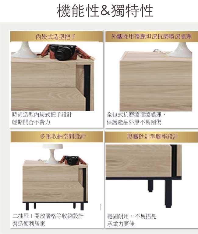 - 採用二抽屜+開放式收納