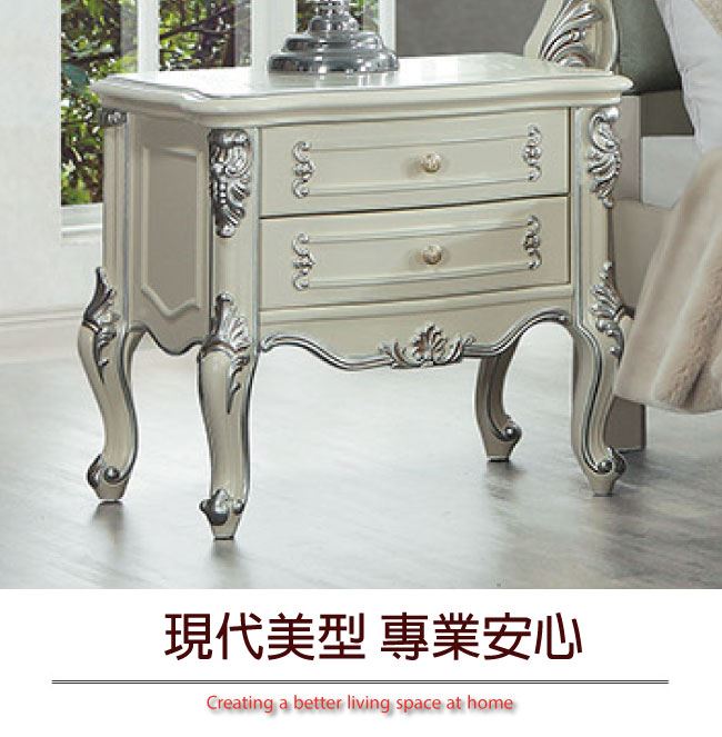 商品介紹 | 【綠家居】安蒂 法式2.3尺二抽床頭櫃 法式啞光銀色系+現代簡約風格+安心材質製造,鏡台整體採用防潮MDF板材+松木實木+曲線造型腳座+五金滑軌結構等安心材質製造,外層採用優利坦全包式亮面噴漆處理搭配二抽屜+開放式桌面收納等收納設計,全由專人配送到家,專業安心服務,替你省下更多時間! 【商品特色】 法式啞光銀色系+現代簡約風格+安心材質製造,使用放心+搭配居家更便利 採用防潮MDF板材+松木實木+曲線造型腳座+五金滑軌結構等安心材質製造 二抽屜+開放式桌面收納等收納設計 此商品不需要DIY組立,此商品為組立後之成品 品質保證、專業設計、貼心服務 全由專人配送到家,專業安心服務,替您省下更多時間 |