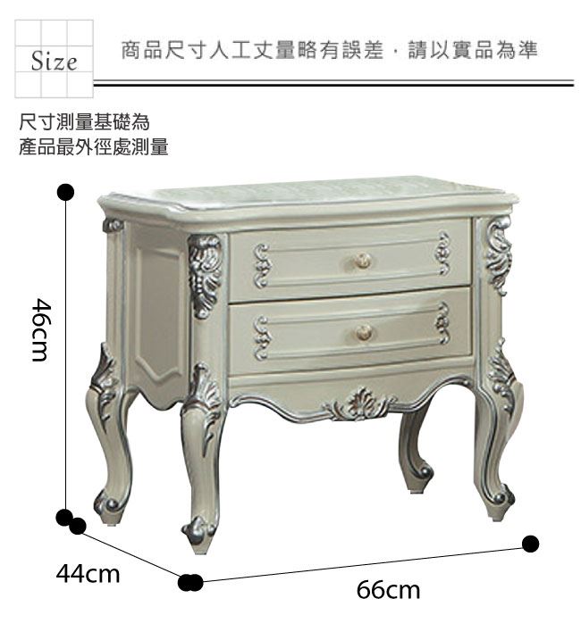 材質 | ◆產品名稱: 【綠家居】安蒂 法式2.3尺二抽床頭櫃 產品尺寸: 尺寸:(寬)66x(深)44x(高)46/公分 ◆材質: 材質:防潮MDF板材+松木實木+曲線造型腳座 材質:五金滑軌結構 塗漆:優利坦全包式亮面噴漆處理