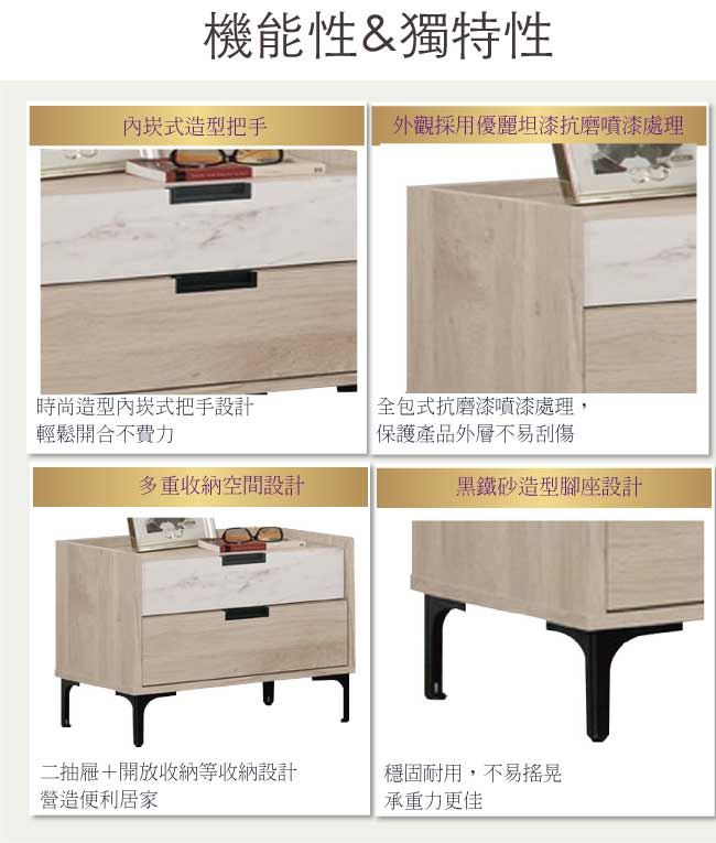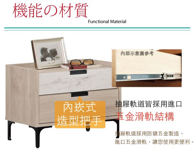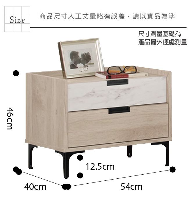 材質 | ◆產品名稱: 【綠家居】查森特 雙色1.8尺二抽床頭櫃 產品尺寸: 尺寸:(寬)54x(深)40x(高)46/公分 ◆材質: 材質:防蛀木心板+黑鐵砂腳座 材質:五金滑軌結構 塗漆:優利坦全包式耐磨&亮面噴漆處理