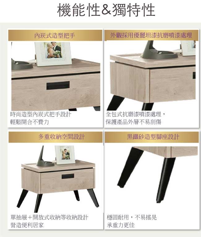 商品介紹 | 【綠家居】薇妮特 橡木紋1.8尺單抽床頭櫃 橡木紋色系+現代簡約風格+安心材質製造,整體採用防蛀木心板+黑鐵砂腳座+五金滑軌結構等安心材質製造,外層採用優利坦全包式耐磨噴漆處理搭配單抽屜+開放式收納等收納空間設計,全由專人配送到家,專業安心服務,替你省下更多時間! 【商品特色】 橡木紋色系+現代簡約風格+安心材質製造,使用放心+搭配居家更便利 採用防蛀木心板+黑鐵砂腳座++五金滑軌結構安心材質製造 單抽屜+開放式收納等收納空間設計 此商品不需要DIY組立,此商品為組立後之成品 品質保證、專業設計、貼心服務 全由專人配送到家,專業安心服務,替您省下更多時間 |