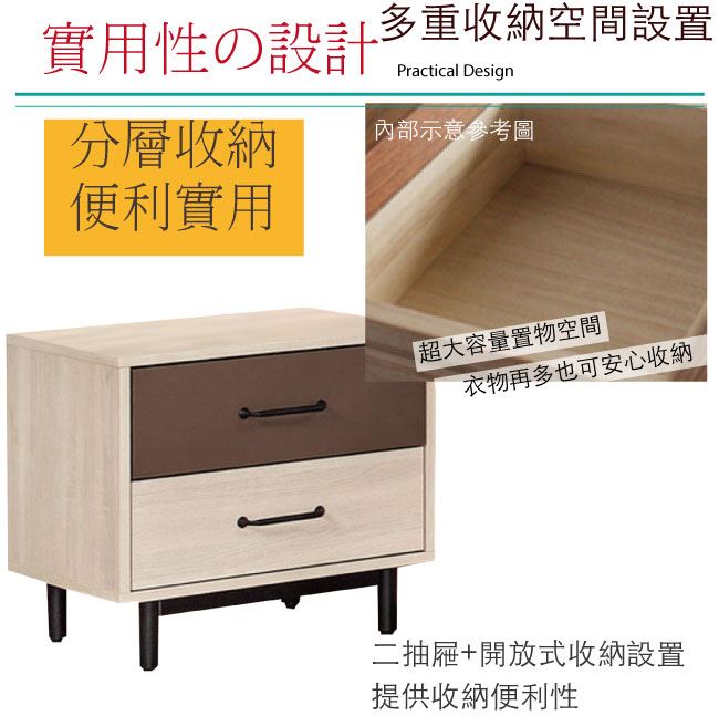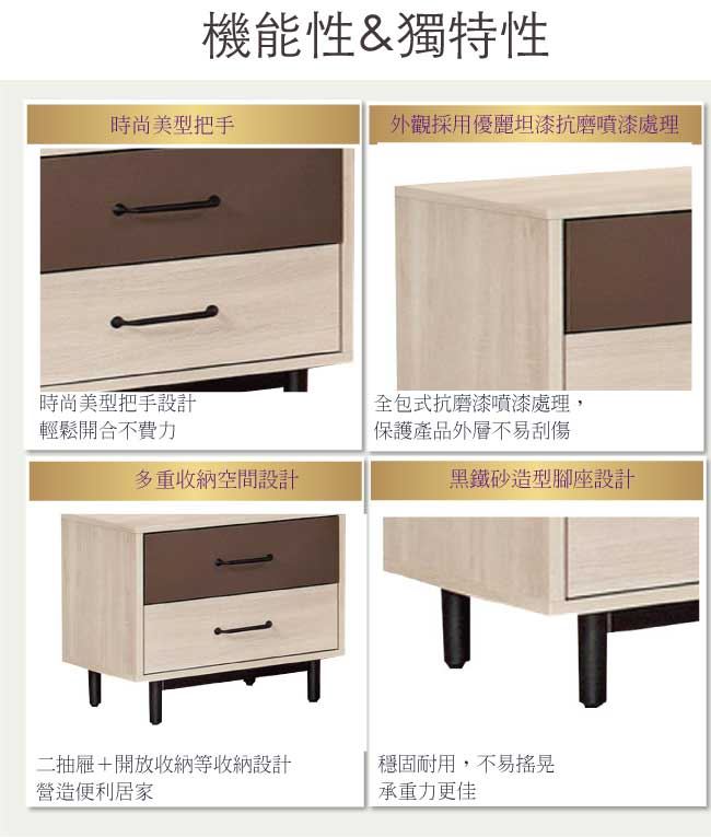 商品介紹 | 【綠家居】畢娜 雙色1.8尺二抽床頭櫃 木紋雙色系+現代簡約風格+安心材質製造,整體採用防蛀木心板+黑鐵砂腳座+五金滑軌結構等安心材質製造,外層採用優利坦全包式耐磨&亮面噴漆處理搭配二抽屜+開放式收納等收納空間設計,全由專人配送到家,專業安心服務,替你省下更多時間! 【商品特色】 木紋雙色系+現代簡約風格+安心材質製造,使用放心+搭配居家更便利 採用防蛀木心板+黑鐵砂腳座+五金滑軌結構安心材質製造 二抽屜+開放式收納等收納空間設計 此商品不需要DIY組立,此商品為組立後之成品 品質保證、專業設計、貼心服務 全由專人配送到家,專業安心服務,替您省下更多時間 |