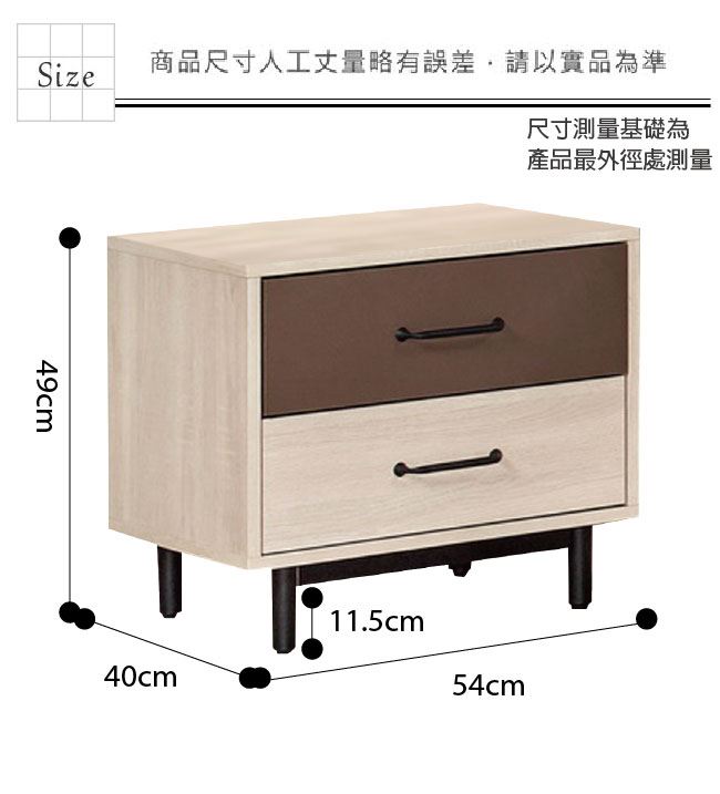材質 | ◆產品名稱: 【綠家居】畢娜 雙色1.8尺二抽床頭櫃 產品尺寸: 尺寸:(寬)54x(深)40x(高)49/公分 ◆材質: 材質:防蛀木心板+黑鐵砂腳座 材質:五金滑軌結構 塗漆:優利坦全包式耐磨&亮面噴漆處理
