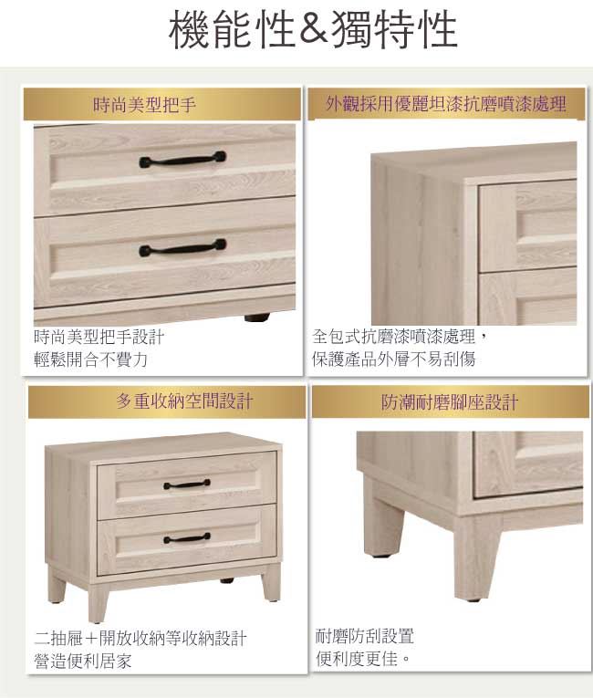 商品介紹 | 【綠家居】馬拉提 淺橡1.8尺二抽床頭櫃 淺橡木紋色系+現代簡約風格+安心材質製造,整體採用防蛀木心板+防潮耐磨腳座+五金滑軌結構等安心材質製造,外層採用優利坦全包式耐磨&亮面噴漆處理搭配二抽屜+開放式收納等收納空間設計,全由專人配送到家,專業安心服務,替你省下更多時間! 【商品特色】 淺橡木紋色系+現代簡約風格+安心材質製造,使用放心+搭配居家更便利 採用防蛀木心板+防潮耐磨腳座+五金滑軌結構安心材質製造 二抽屜+開放式收納等收納空間設計 此商品不需要DIY組立,此商品為組立後之成品 品質保證、專業設計、貼心服務 全由專人配送到家,專業安心服務,替您省下更多時間 |