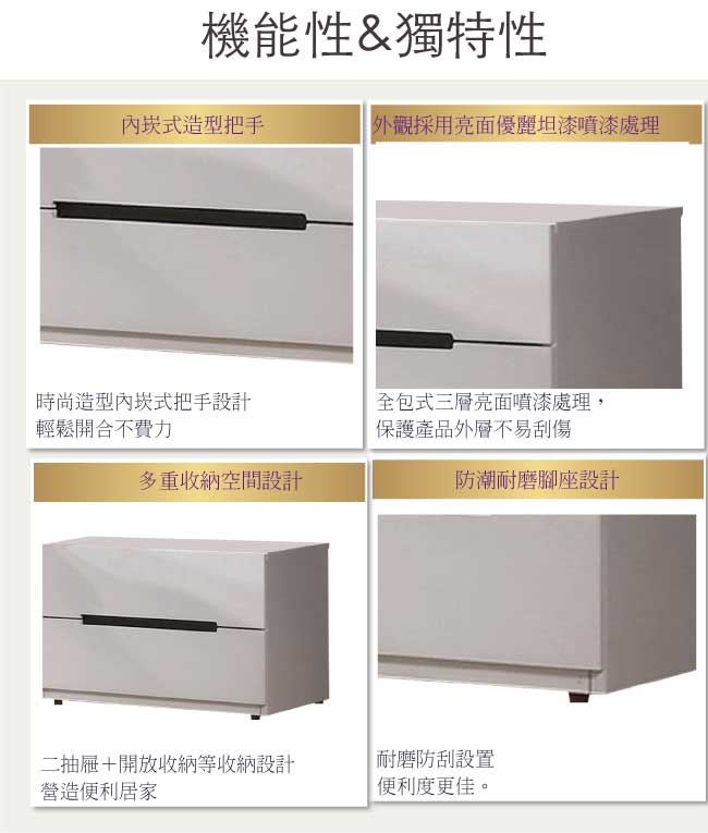 商品 介紹 | 【綠家居】律法瑪 現代白1.9尺二抽床頭櫃 現代白色系+現代簡約風格+安心材質製造,整體採用防蛀木心板+防潮MDF板材+防潮耐磨腳座+五金滑軌結構等安心材質製造,外層採用優利坦全包式亮面噴漆處理搭配二抽屜+開放式收納等收納空間設計,全由專人配送到家,專業安心服務,替你省下更多時間! 【商品特色】 現代白色系+現代簡約風格+安心材質製造,使用放心+搭配居家更便利 採用防蛀木心板+防潮MDF板材+防潮耐磨腳座+五金滑軌結構安心材質製造 二抽屜+開放式收納等收納空間設計 此商品不需要DIY組立,此商品為組立後之成品 品質保證、專業設計、貼心服務 全由專人配送到家,專業安心服務,替您省下更多時間 |