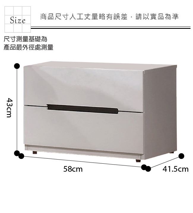 材質 | ◆產品名稱: 【綠家居】律法瑪 現代白1.9尺二抽床頭櫃 產品尺寸: 尺寸:(寬)58x(深)41.5x(高)43/公分 ◆材質: 材質:防蛀木心板+防潮MDF板材+防潮耐磨腳座 材質:五金滑軌結構 塗漆:優利坦全包式亮面噴漆處理