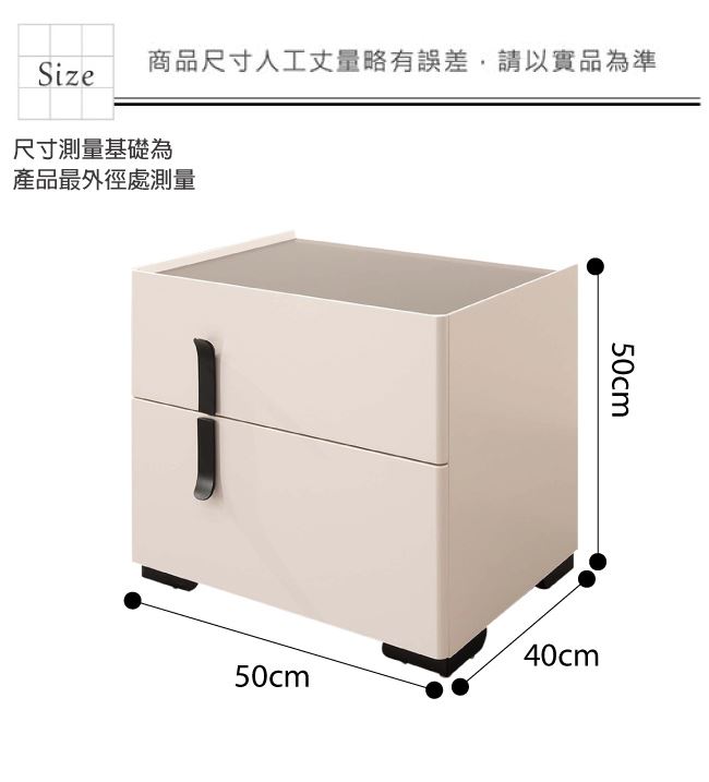 材質 | ◆產品名稱: 【綠家居】英里亞 雙色1.7尺二抽床頭櫃/收納櫃 尺寸:(寬)50x(深)40x(高)50/公分 ◆材質: 材質:防潮MDF板材+五金滑軌結構+防鏽黑漆五金腳座 噴漆:防潮亮面噴漆處理