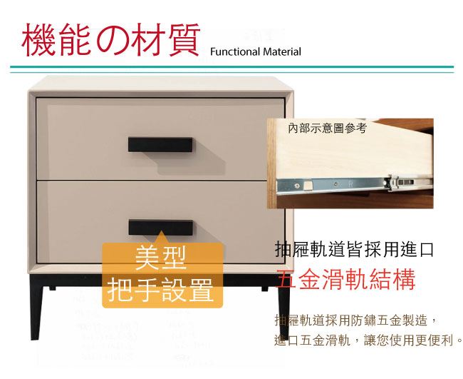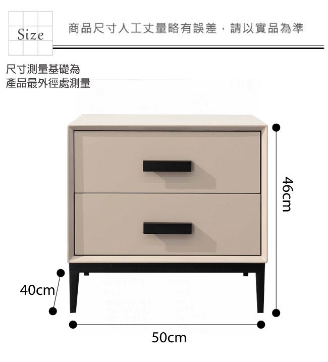 材質 | ◆產品名稱: 【綠家居】哥倫 雙色1.7尺二抽床頭櫃/收納櫃 尺寸:(寬)50x(深)40x(高)46/公分 ◆材質: 材質:防潮MDF板材+五金滑軌結構+防鏽黑漆五金腳座 噴漆:防潮亮面噴漆處理