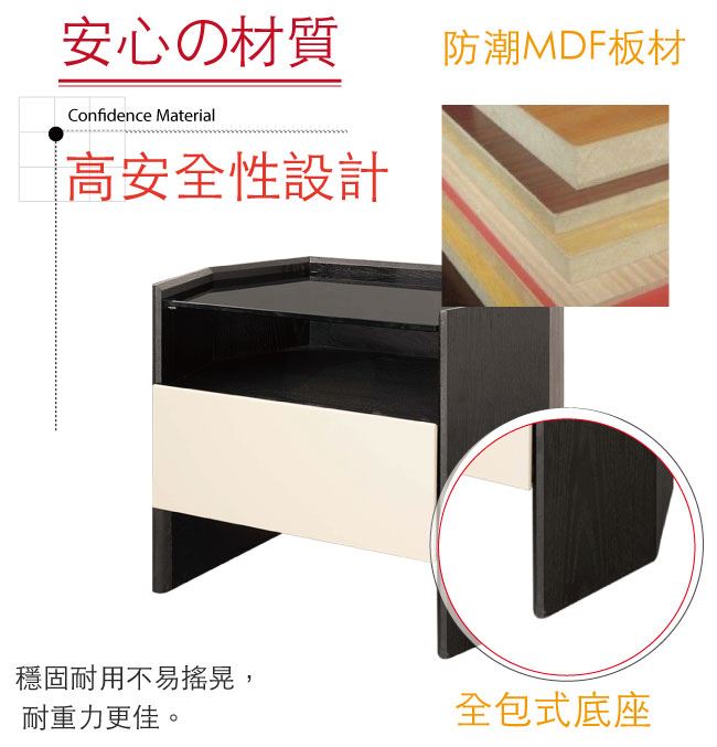 材質 | ◆產品名稱: 【綠家居】坦伊格 雙色2尺單抽玻璃床頭櫃/收納櫃 尺寸:(寬)60x(深)42x(高)52/公分 ◆材質: 材質:防潮MDF板材+五金滑軌結構+全包式腳座+6mm強化玻璃桌面 噴漆:防潮耐磨&亮面噴漆處理