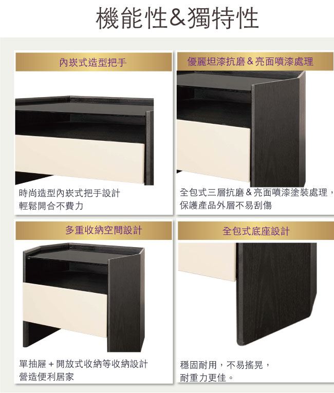 商品 介紹 | 【綠家居】坦伊格 雙色2尺單抽玻璃床頭櫃/收納櫃 時尚雙色系+現代簡約風格+安心材質製造,整體採用防潮MDF板材+五金滑軌結構+全包式腳座+6mm強化玻璃等安心材質製造,產品外層採用防潮耐磨&亮面噴漆處理搭配採用二抽屜+開放式收納層格等收納空間設計,全由專人配送到家,專業安心服務,替你省下更多時間! 【商品特色】 時尚雙色系+現代簡約風格+安心材質製造,使用放心+搭配居家更便利 採用防潮MDF板材+五金滑軌結構+全包式腳座+6mm強化玻璃等安心材質製造 產品外層採用防潮耐磨&亮面噴漆處理搭配採用二抽屜+開放式收納層格等收納空間設計 此商品不需要DIY組立,此商品為組立後之成品 品質保證、專業設計、貼心服務 全由專人配送到家,專業安心服務,替您省下更多時間 |