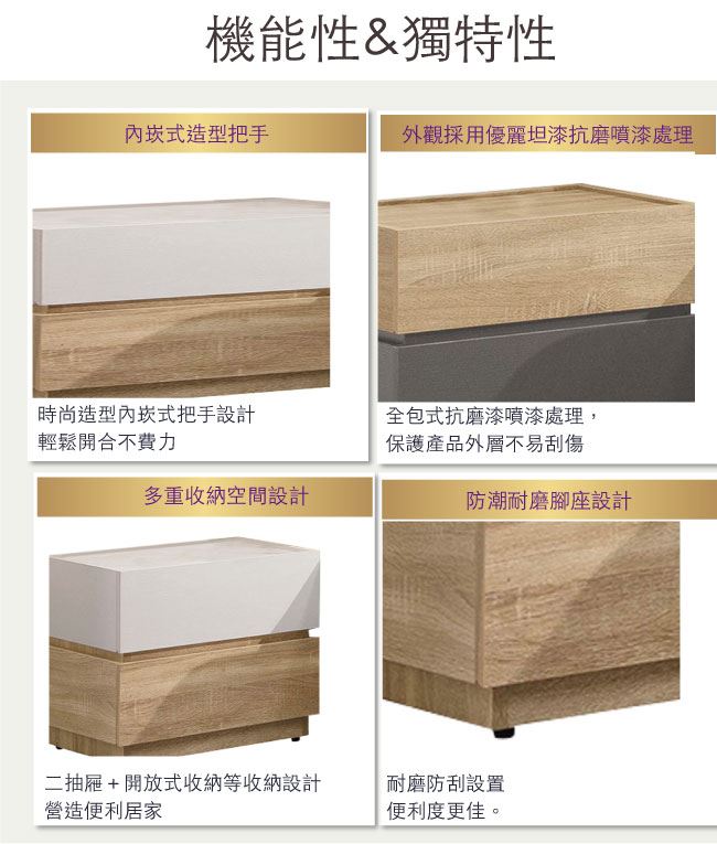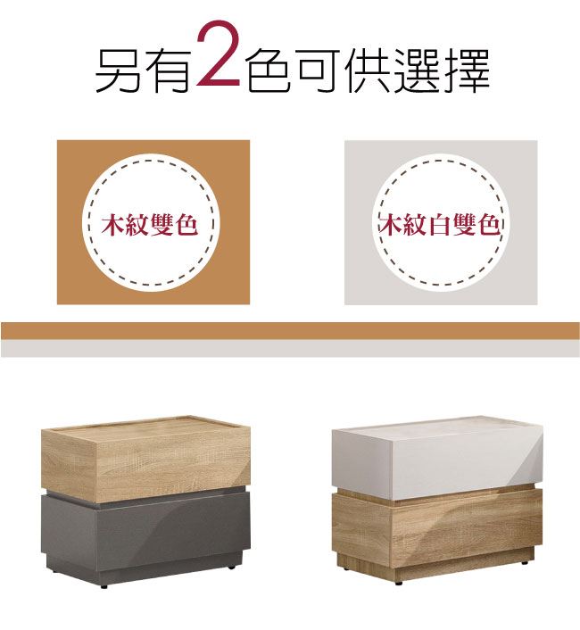 商品 介紹 | 【綠家居】科羅利 雙色1.7尺二抽床頭櫃/收納櫃(二色可選) 二色可選+現代簡約風格+安心材質製造,整體採用防蛀木心板+五金滑軌結構+防潮耐磨腳座等安心材質製造,產品外層採用防潮耐磨噴漆處理搭配採用二抽屜+開放式收納層格等收納空間設計,全由專人配送到家,專業安心服務,替你省下更多時間! 【商品特色】 二色可選+現代簡約風格+安心材質製造,使用放心+搭配居家更便利 採用防蛀木心板+五金滑軌結構+防潮耐磨腳座等安心材質製造 產品外層採用防潮耐磨噴漆處理搭配採用二抽屜+開放式收納層格等收納空間設計 此商品不需要DIY組立,此商品為組立後之成品 品質保證、專業設計、貼心服務 全由專人配送到家,專業安心服務,替您省下更多時間 |