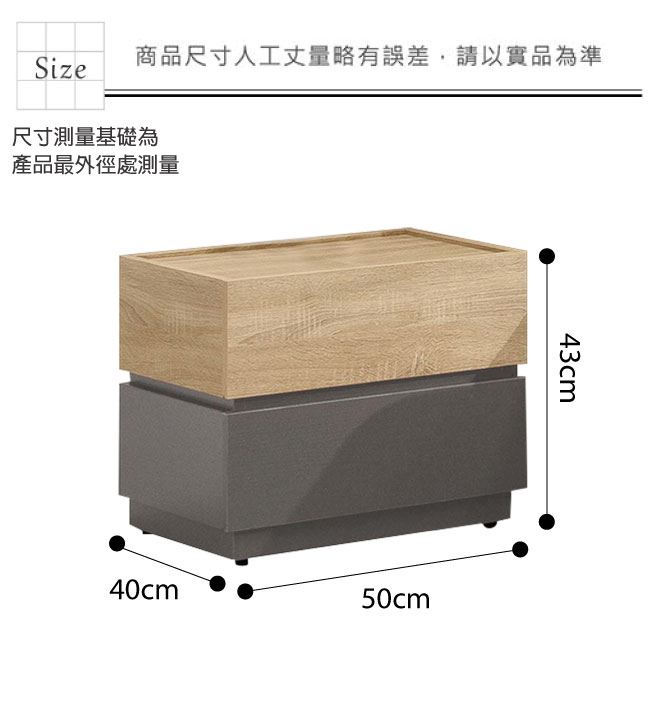 材質 | ◆產品名稱: 【綠家居】科羅利 雙色1.7尺二抽床頭櫃/收納櫃(二色可選) 尺寸:(寬)50x(深)40x(高)43/公分 ◆材質: 材質:防蛀木心板+五金滑軌結構+防潮耐磨腳座 噴漆:防潮耐磨噴漆處理