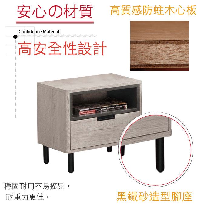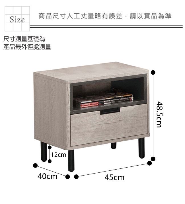 材質 | ◆產品名稱: 【綠家居】古利德 時尚1.5尺單抽床頭櫃/收納櫃 尺寸:(寬)45x(深)40x(高)48.5/公分 ◆材質: 材質:防蛀木心板+五金滑軌結構+防鏽黑漆腳座 噴漆:防潮耐磨&亮面噴漆處理