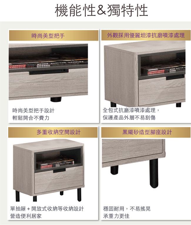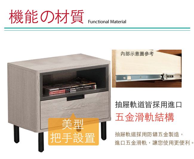 商品 介紹 | 【綠家居】古利德 時尚1.5尺單抽床頭櫃/收納櫃 橡木紋色系+現代簡約風格+安心材質製造,整體採用防蛀木心板+五金滑軌結構+防鏽黑漆腳座等安心材質製造,產品外層採用防潮耐磨&亮面噴漆處理搭配採用單抽屜+開放式收納層格等收納空間設計,全由專人配送到家,專業安心服務,替你省下更多時間! 【商品特色】 橡木紋色系+現代簡約風格+安心材質製造,使用放心+搭配居家更便利 採用防蛀木心板+五金滑軌結構+防鏽黑漆腳座等安心材質製造 產品外層採用防潮&亮面耐磨噴漆處理搭配採用單抽屜+開放式收納層格等收納空間設計 此商品不需要DIY組立,此商品為組立後之成品 品質保證、專業設計、貼心服務 全由專人配送到家,專業安心服務,替您省下更多時間 |
