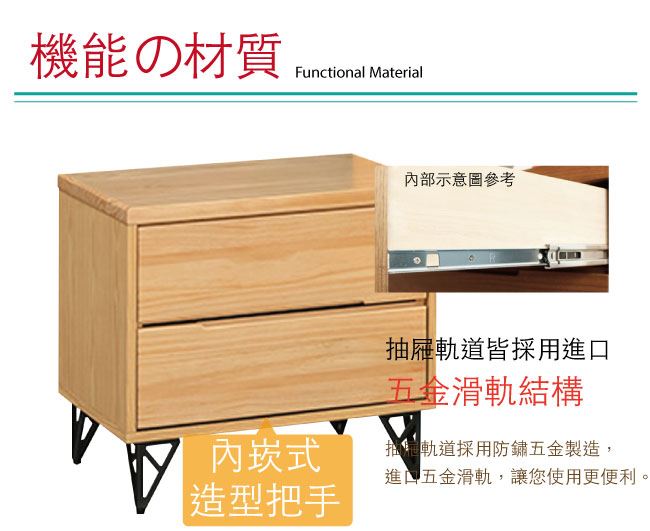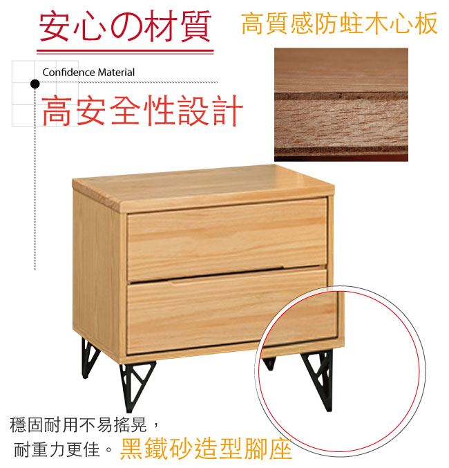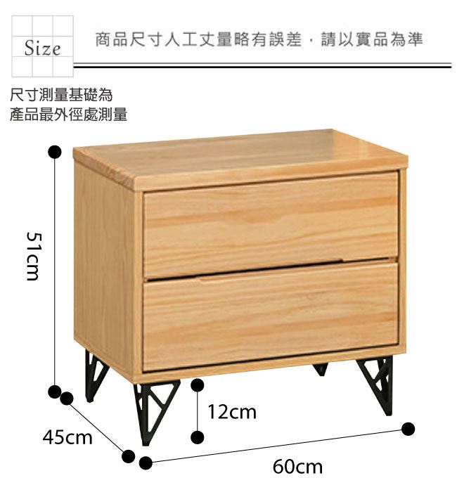 材質 | ◆產品名稱: 【綠家居】比勒 時尚2尺實木二抽床頭櫃/收納櫃 尺寸:(寬)60x(深)45x(高)51/公分 ◆材質: 材質:松木實木+防蛀木心板+五金滑軌結構+黑鐵砂腳座