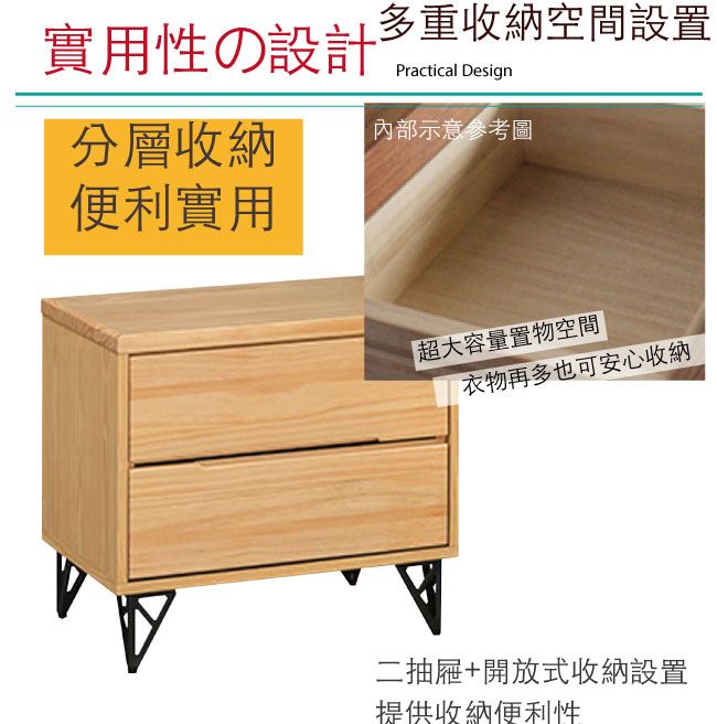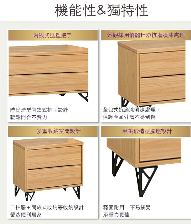 商品 介紹 | 【綠家居】約哈爾 時尚1.6尺二抽床頭櫃/收納櫃 原木紋色+現代簡約風格+安心材質製造,整體採用松木實木+防蛀木心板+五金滑軌結構+黑鐵砂腳座等安心材質製造,搭配採用二抽屜+開放式收納層格等收納空間設計,全由專人配送到家,專業安心服務,替你省下更多時間! 【商品特色】 原木紋色+現代簡約風格+安心材質製造,使用放心+搭配居家更便利 採用松木實木+防蛀木心板+五金滑軌結構+黑鐵砂腳座等安心材質製造 採用二抽屜+開放式收納層格等收納空間設計 此商品不需要DIY組立,此商品為組立後之成品 品質保證、專業設計、貼心服務 全由專人配送到家,專業安心服務,替您省下更多時間 |