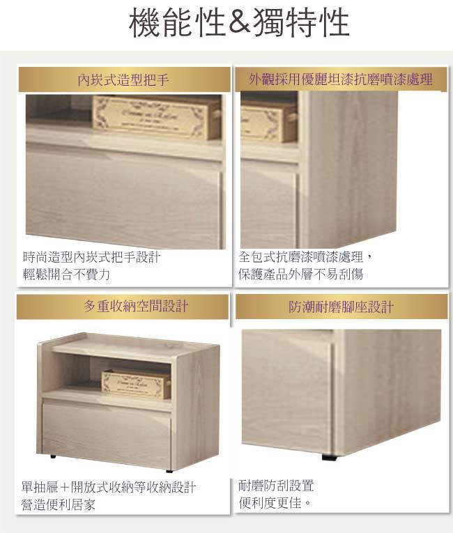 商品 介紹 | 【綠家居】卡西斯 淺橡1.6尺單抽床頭櫃 淺橡木紋色系+現代簡約風格+安心材質製造,鏡台整體採用防蛀木心板+五金滑軌結構+防潮耐磨腳座等安心材質製造,外層採用優利坦全包式耐磨噴漆處理搭配單抽屜+開放式收納等收納空間設計,全由專人配送到家,專業安心服務,替你省下更多時間! 【商品特色】 淺橡木紋色系+現代簡約風格+安心材質製造,使用放心+搭配居家更便利 採用防蛀木心板+五金滑軌結構+防潮耐磨腳座等安心材質製造 單抽屜+開放式收納等收納空間設計 此商品不需要DIY組立,此商品為組立後之成品 品質保證、專業設計、貼心服務 全由專人配送到家,專業安心服務,替您省下更多時間 |