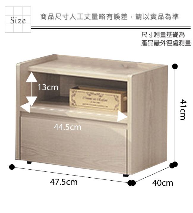 材質 | ◆產品名稱: 【綠家居】卡西斯 淺橡1.6尺單抽床頭櫃 產品尺寸: 尺寸:(寬)47.5x(深)40x(高)41/公分 ◆材質: 材質:防蛀木心板+防潮耐磨腳座 材質:五金滑軌結構 塗漆:優利坦全包式耐磨噴漆處理