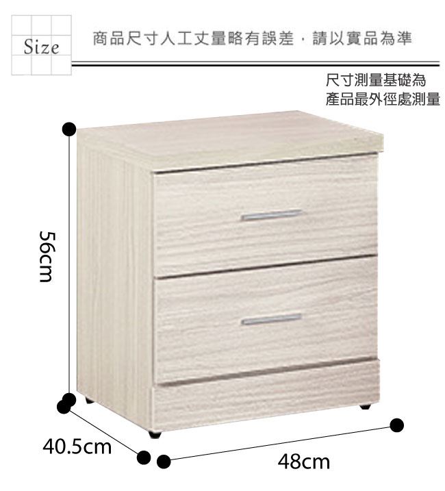 材質 | ◆產品名稱: 【綠家居】福瑞 梣木紋1.6尺二抽床頭櫃 產品尺寸: 尺寸:(寬)48x(深)40.5x(高)56/公分 ◆材質: 材質:防蛀木心板+防潮耐磨腳座 材質:五金滑軌結構 塗漆:優利坦全包式耐磨噴漆處理
