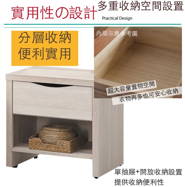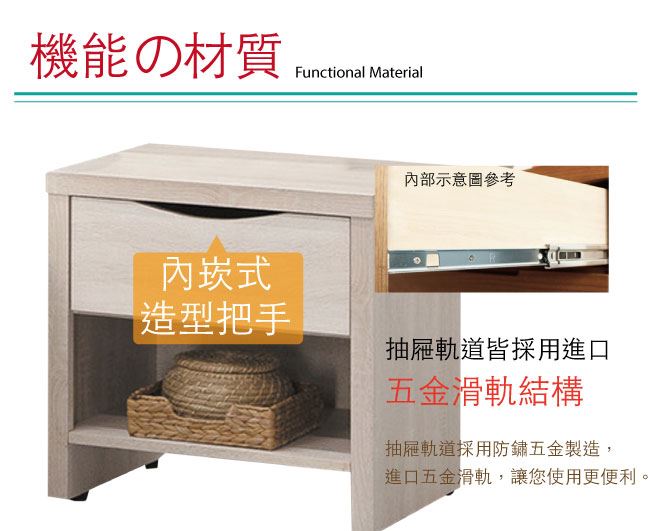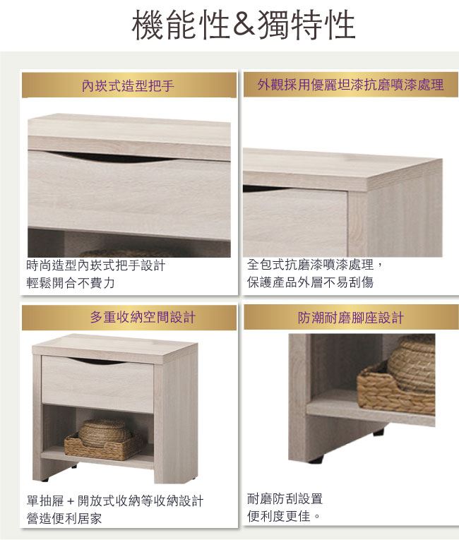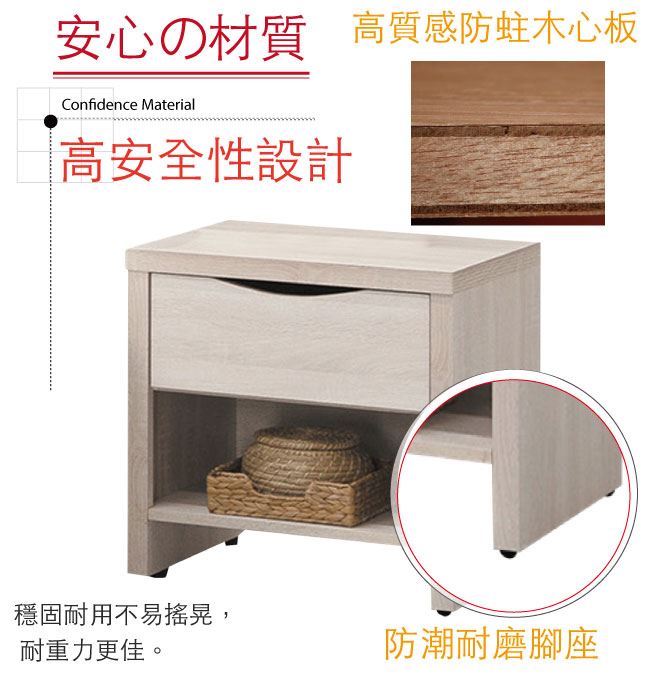 商 品 介 紹 | 【綠家居】提米 時尚1.7尺單抽床頭櫃/收納櫃 淺橡木紋色系+現代簡約風格+安心材質製造,整體採用防蛀木心板+五金滑軌結構+防刮耐磨腳座等安心材質製造,外層採用防潮耐磨噴漆處理搭配採用單抽屜+開放式收納層格等收納空間設計,全由專人配送到家,專業安心服務,替你省下更多時間! 【商品特色】 淺橡木紋色系+現代簡約風格+安心材質製造,使用放心+搭配居家更便利 採用防蛀木心板+五金滑軌結構+防刮耐磨腳座等安心材質製造 採用單抽屜+開放式收納層格等收納空間設計 此商品不需要DIY組立,此商品為組立後之成品 品質保證、專業設計、貼心服務 全由專人配送到家,專業安心服務,替您省下更多時間 |