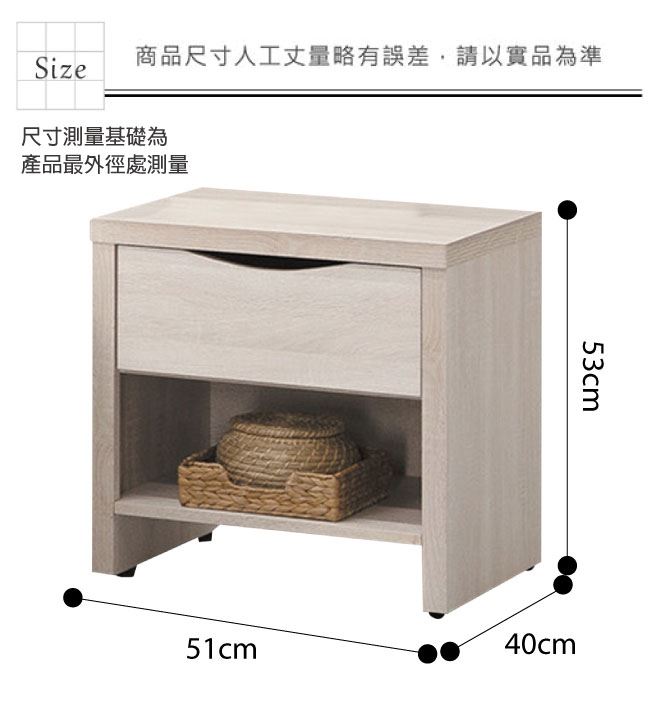 材質 | ◆產品名稱: 【綠家居】提米 時尚1.7尺單抽床頭櫃/收納櫃 尺寸:(寬)51x(深)40x(高)53/公分 ◆材質: 材質:防蛀木心板+五金滑軌結構+防刮耐磨腳座 外層採用防潮耐磨噴漆處理