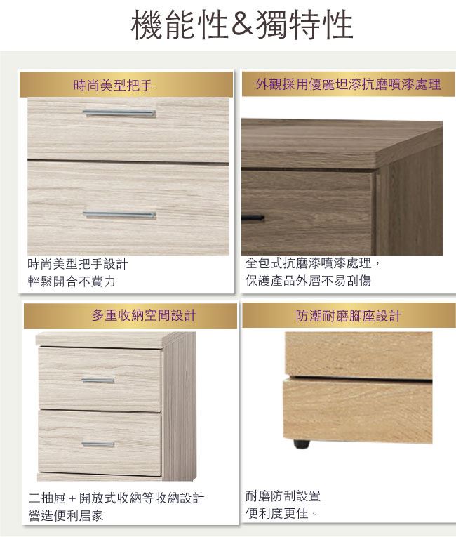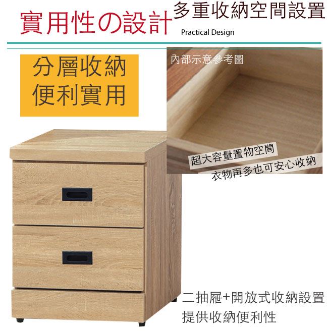 - 採用二抽屜+開放式收納