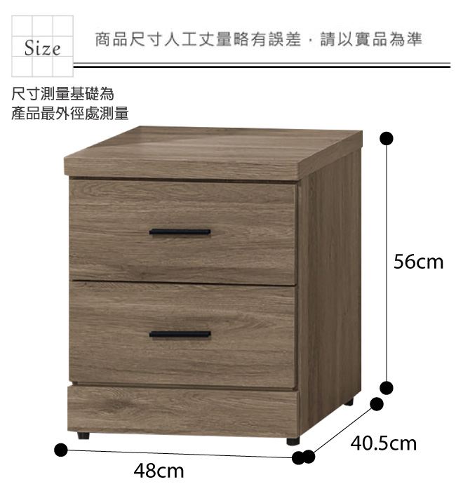 材質 | ◆產品名稱: 【綠家居】艾梅維 時尚1.6尺二抽床頭櫃/收納櫃(三色可選) 尺寸:(寬)48x(深)40.5x(高)56/公分 ◆材質: 材質:防蛀木心板+防潮耐磨腳座+五金滑軌結構 外層採用全包式防潮耐磨噴漆處理