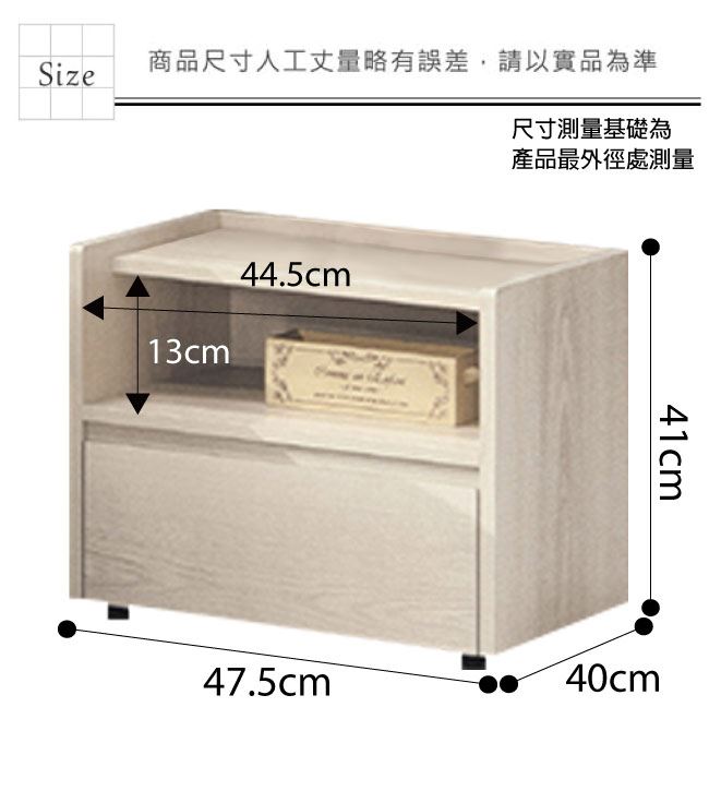 尺寸:(寬)47.5x(深)40(高)41公分 ◆材質: 材質:防蛀木心板+防潮耐磨腳座+五金滑軌結構 噴漆:防潮耐磨噴漆處理