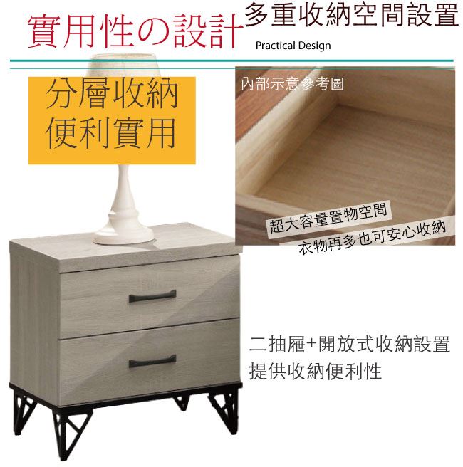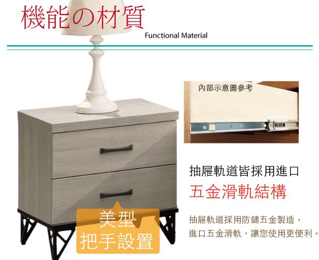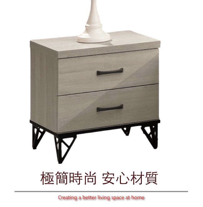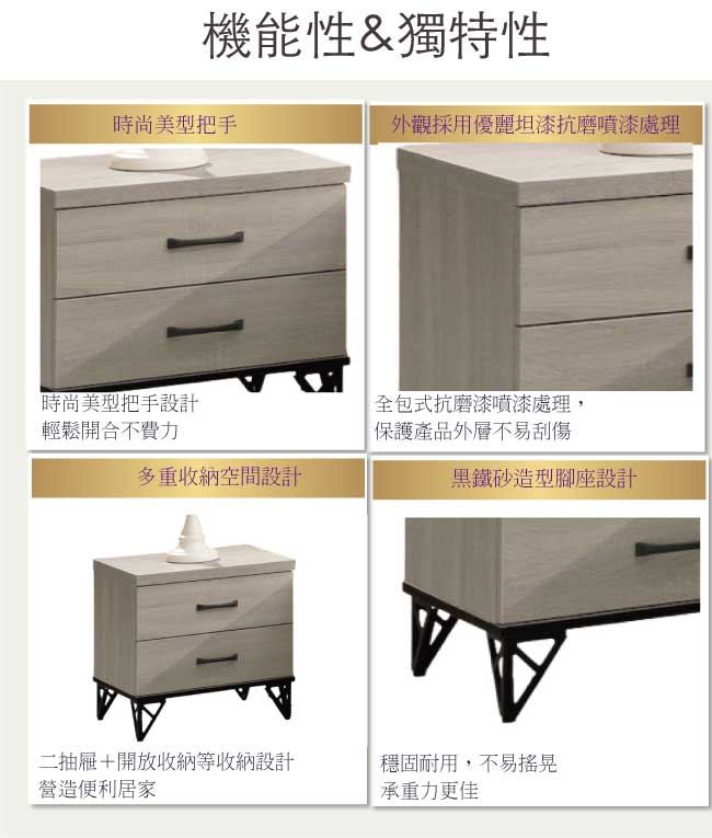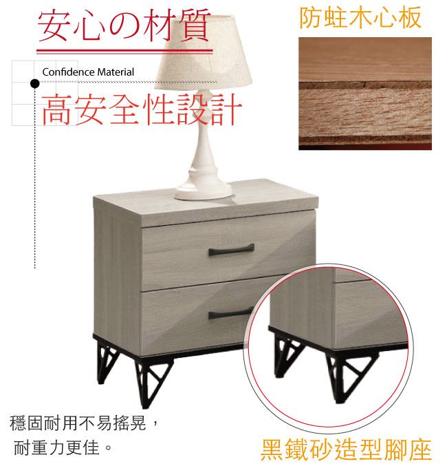 商 品 介 紹 | 【綠家居】查德勒 灰橡紋1.6尺二抽床頭櫃 淺灰橡木紋色系+現代簡約風格+安心材質製造,整體採用防蛀木心板+黑鐵砂腳座+五金滑軌結構等安心材質製造,外層採用優利坦全包式耐磨噴漆處理搭配二抽屜+開放式收納等收納空間設計,全由專人配送到家,專業安心服務,替你省下更多時間! 【商品特色】 淺灰橡木紋色系+現代簡約風格+安心材質製造,使用放心+搭配居家更便利 採用防蛀木心板+黑鐵砂腳座++五金滑軌結構安心材質製造 二抽屜+開放式收納等收納空間設計 此商品不需要DIY組立,此商品為組立後之成品 品質保證、專業設計、貼心服務 全由專人配送到家,專業安心服務,替您省下更多時間