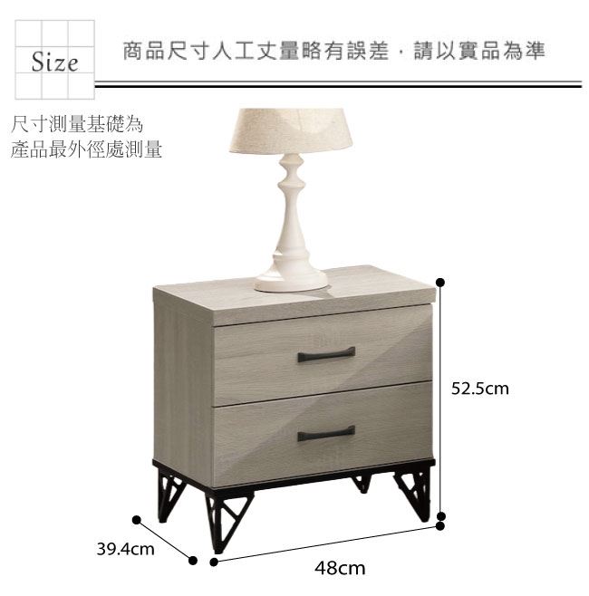 產品名稱:【綠家居】查德勒 灰橡紋1.6尺二抽床頭櫃 產品尺寸: 尺寸:(寬)48x(深)39.4x(高)52.5/公分 ◆材質: 材質:防蛀木心板+黑鐵砂腳座 材質:五金滑軌結構 塗漆:優利坦全包式耐磨噴漆處理