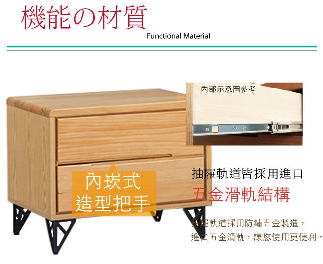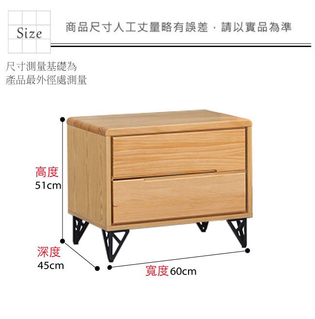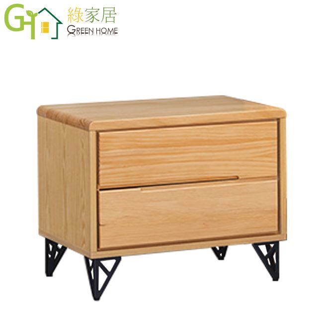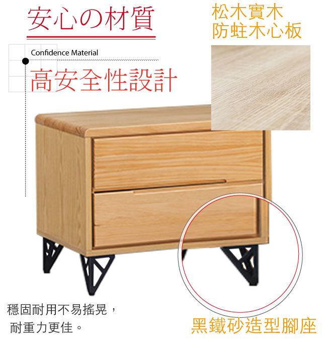 材質 | ◆產品名稱:【綠家居】羅安實木2尺二抽床頭櫃 尺寸:(寬)60x(深)45(高)51/公分 ◆材質: 材質:松木實木+防蛀木心板+黑鐵砂腳座+五金滑軌結構 噴漆:防潮耐磨噴漆處理