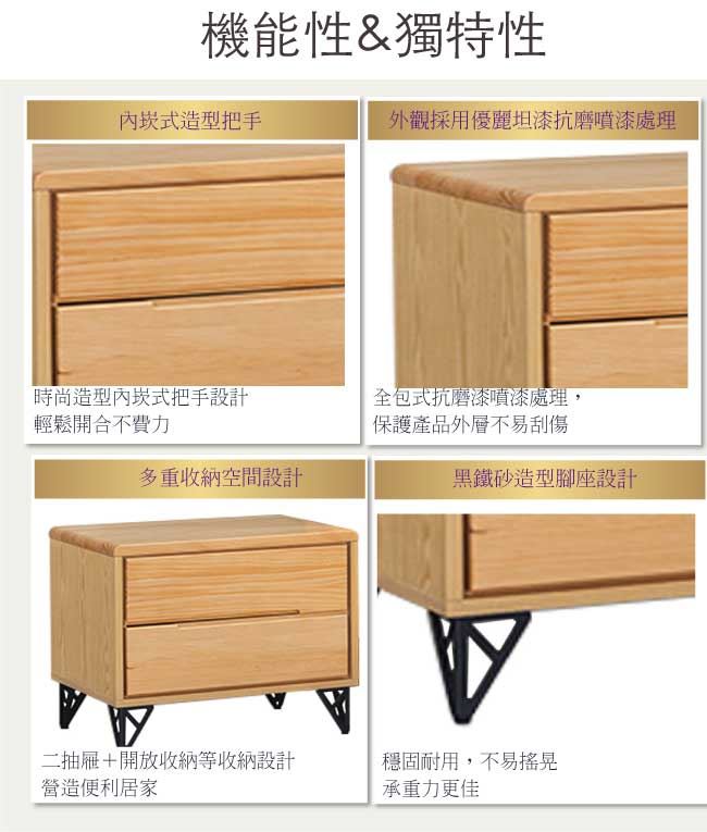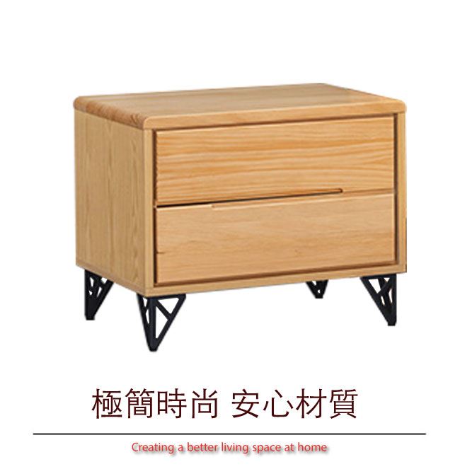商 品 介 紹 | 【綠家居】羅安實木2尺二抽床頭櫃 原木紋色系+現代簡約風格+安心材質製造,整體採用松木實木+防蛀木心板+黑鐵砂腳座+五金滑軌結構等安心材質製造,產品外層採用防潮耐磨噴漆處理搭配採用二抽屜+開放式收納等收納空間設計,全由專人配送到家,專業安心服務,替你省下更多時間! 【商品特色】 原木紋色系+現代簡約風格+安心材質製造,使用放心+搭配居家更便利 採用松木實木+防蛀木心板+黑鐵砂腳座+五金滑軌結構等安心材質製造 產品外層採用防潮耐磨噴漆處理 搭配採用二抽屜+開放式收納等收納空間設計 此商品不需要DIY組立,此商品為組立後之成品 品質保證、專業設計、貼心服務 全由專人配送到家,專業安心服務,替您省下更多時間