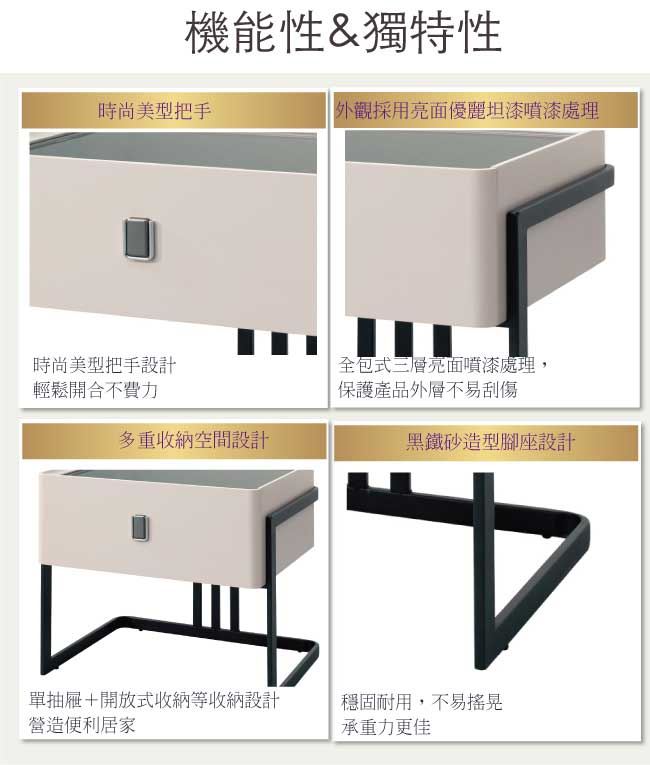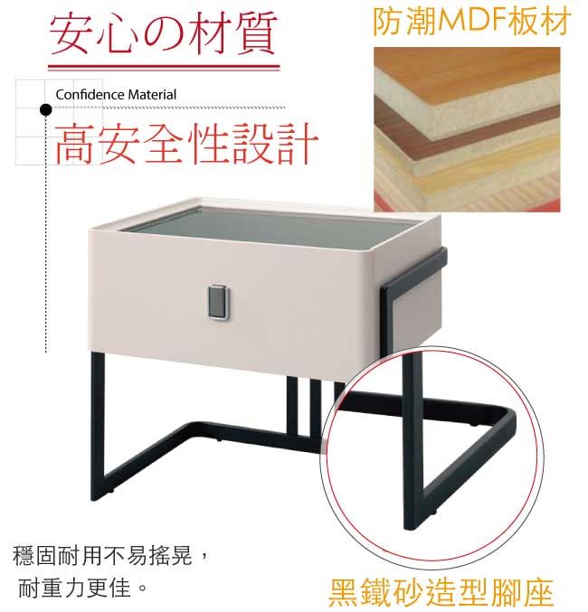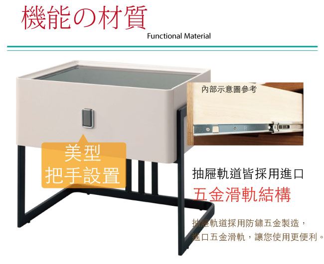 材質 | ◆產品名稱:【綠家居】阿迪斯1.7尺玻璃單抽床頭櫃 尺寸:(寬)50x(深)40(高)50/公分 ◆材質: 材質:防潮MDF板材+防鏽黑漆腳座+緩衝式滑軌結構+6mm強化黑玻桌面 噴漆:防潮亮面噴漆處理
