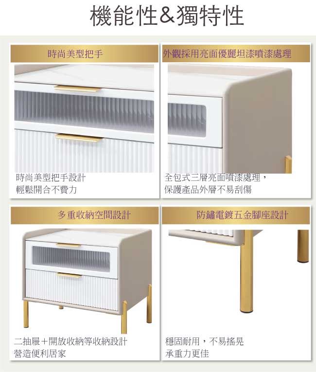 商 品 介 紹 | 【綠家居】厄利1.6尺岩板二抽床頭櫃 奢華白色系+現代簡約風格+安心材質製造,整體採用防潮MDF板材+防鏽金漆腳座+五金滑軌結構+6mm高硬度岩板桌面等安心材質製造,產品外層採用防潮亮面噴漆處理搭配採用二抽屜+開放式收納等收納空間設計,全由專人配送到家,專業安心服務,替你省下更多時間! 【商品特色】 奢華白色系+現代簡約風格+安心材質製造,使用放心+搭配居家更便利 採用防潮MDF板材+防鏽金漆腳座+五金滑軌結構+6mm高硬度岩板桌面等安心材質製造 產品外層採用防潮亮面噴漆處理 搭配採用二抽屜+開放式收納等收納空間設計 此商品不需要DIY組立,此商品為組立後之成品 品質保證、專業設計、貼心服務 全由專人配送到家,專業安心服務,替您省下更多時間